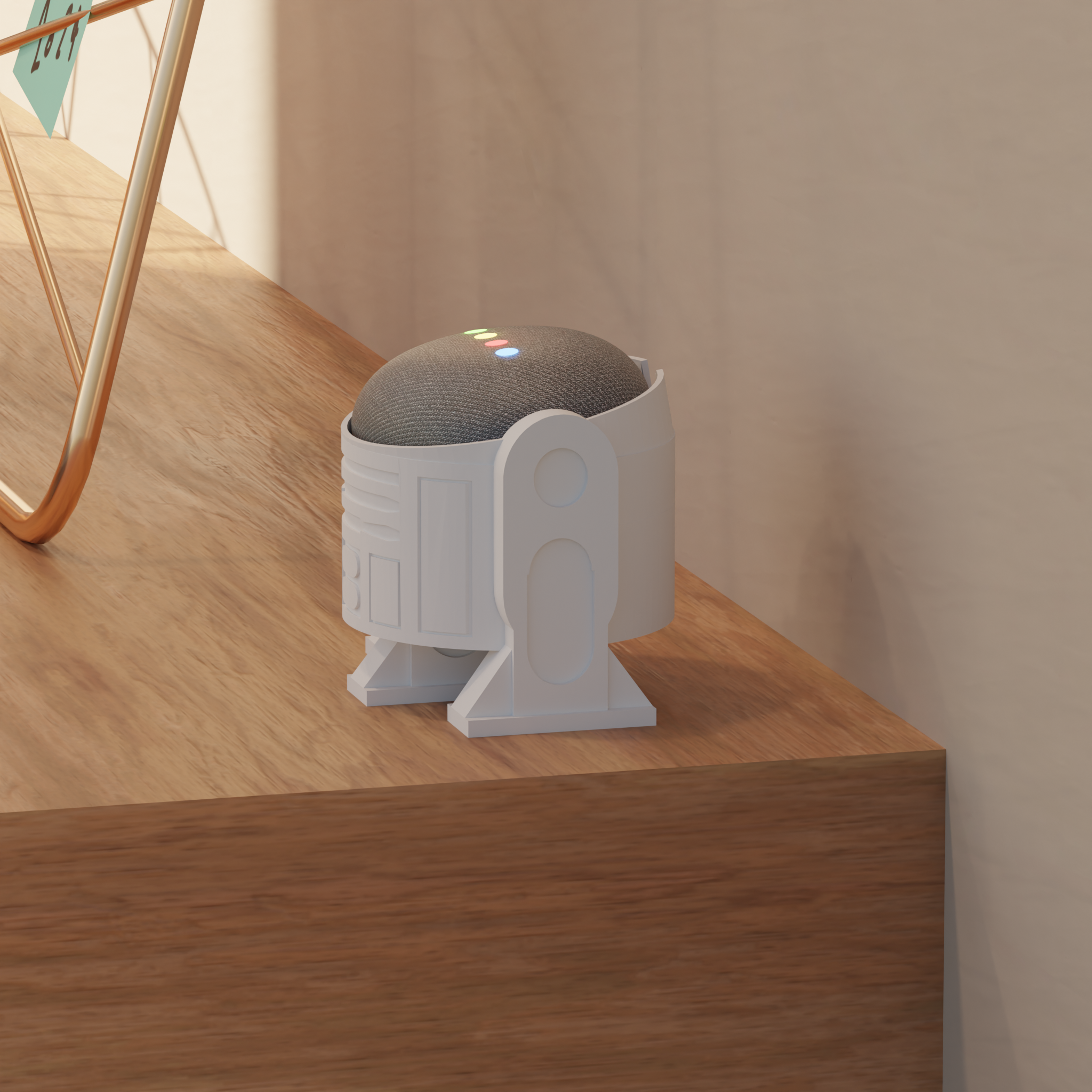 Sjov holder til en Google Nest Mini 2nd generation, der er udformet som R2D2 fra Star Wars.