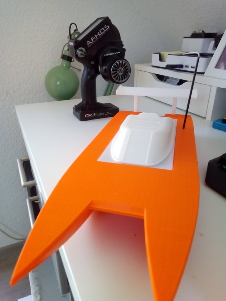 For at fuldende udseendet kommer designet med en aftagelig top og en agtervinge, der bidrager til både æstetik og hydrodynamik. For komplet funktion skal du bruge mindst ét 625 leje (to for ekstra stabilitet), en 3 mm aksel og en kobling, der passer til din motors aksel.