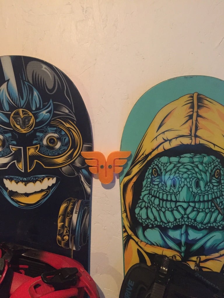 Vægmontering til snowboard fra Thrive Snowboards. To af disse kan bruges til at hænge et snowboard lodret på en væg. Den perfekte måde at opbevare dit snowboard på, på en sikker og stilfuld måde.