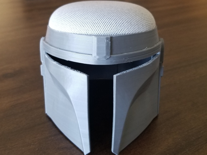 Sjov holder til en Google Home Nest 2nd generation, der er udformet som en Mandalorian hjelm fra Star Wars.