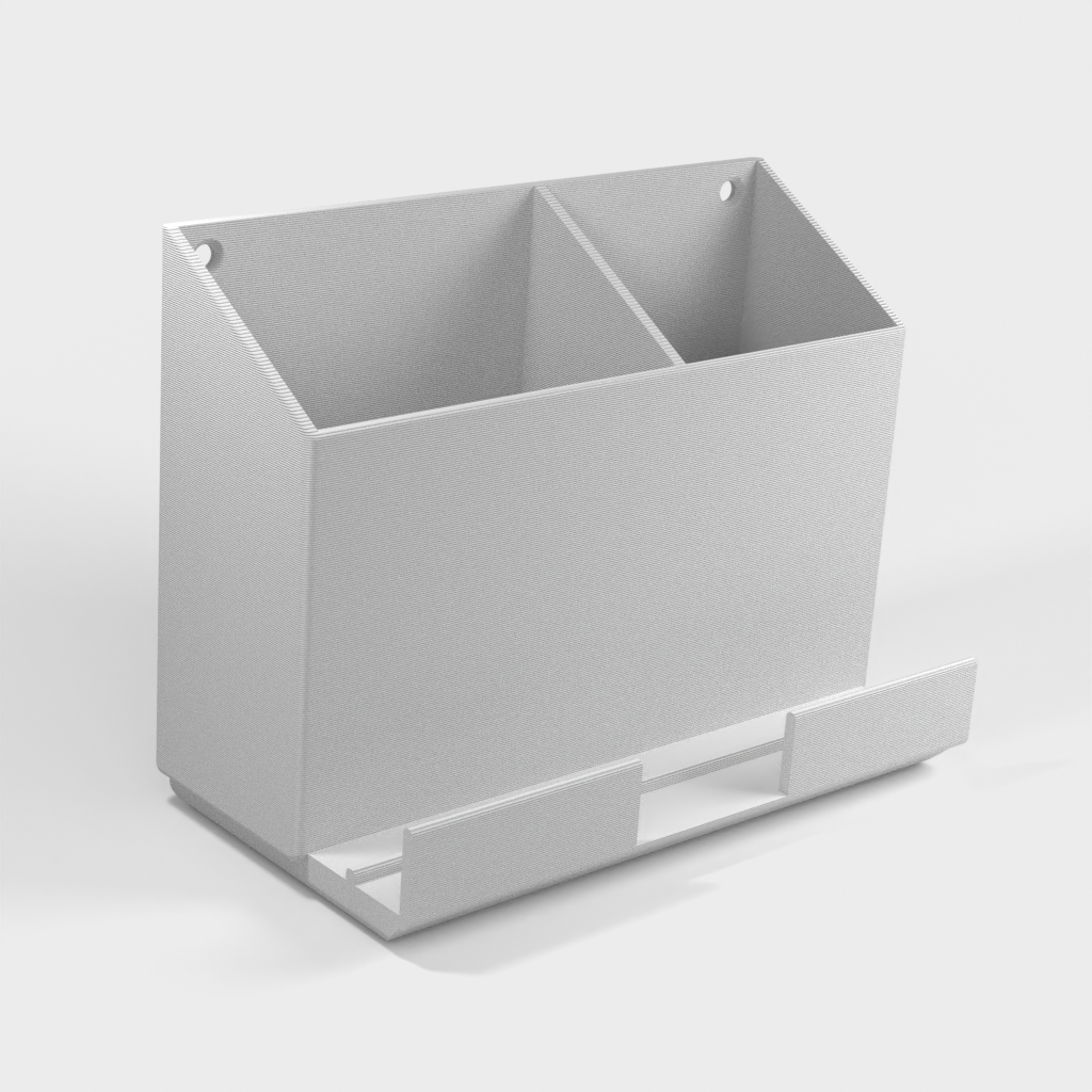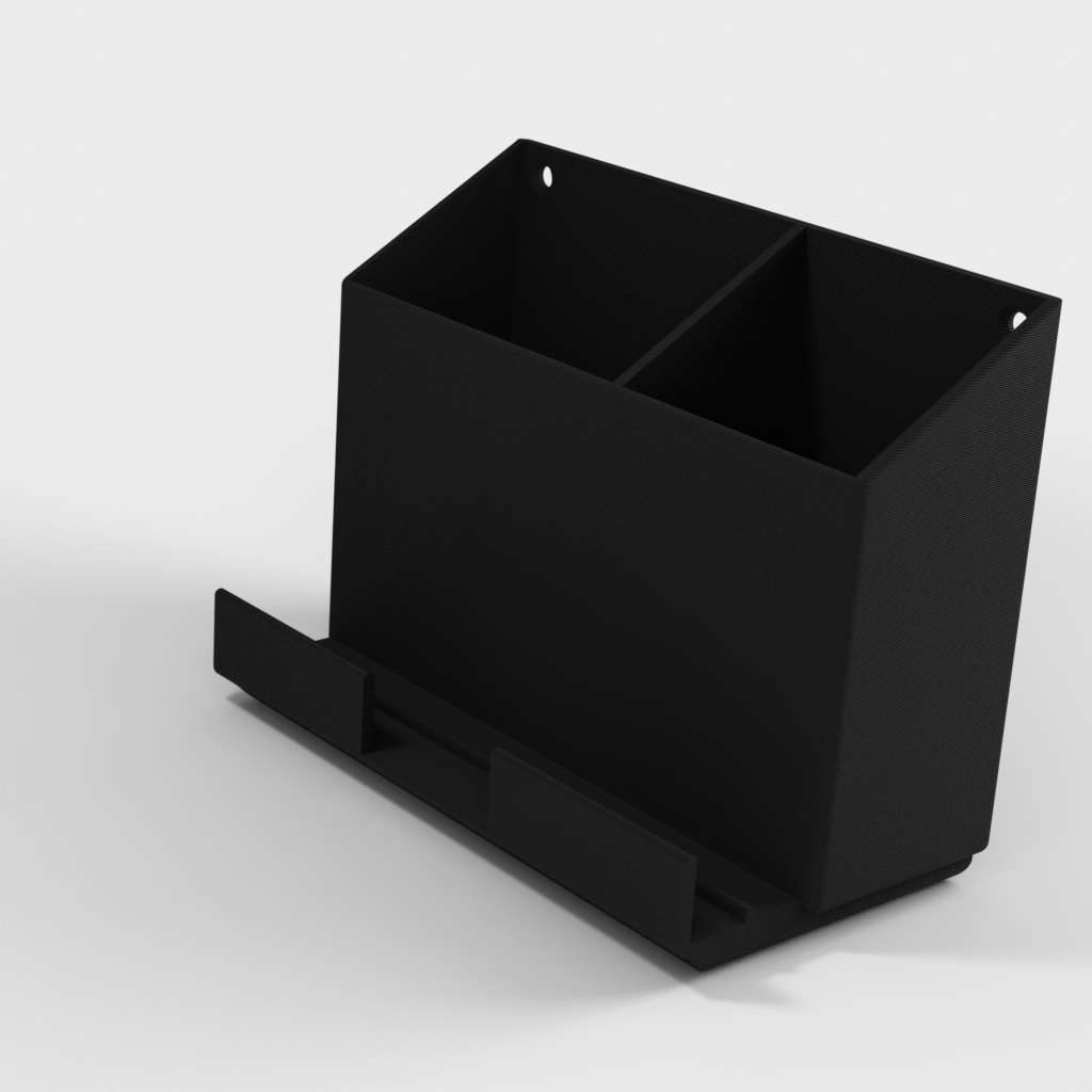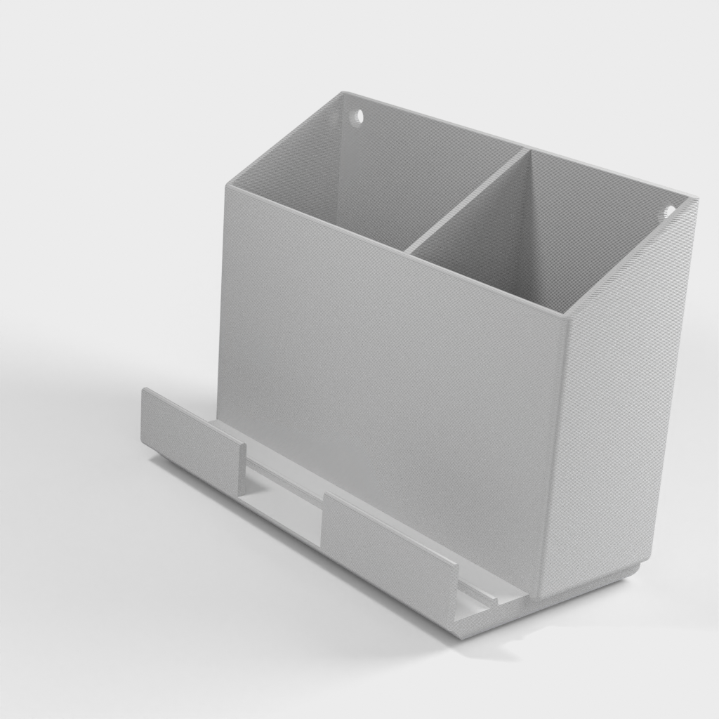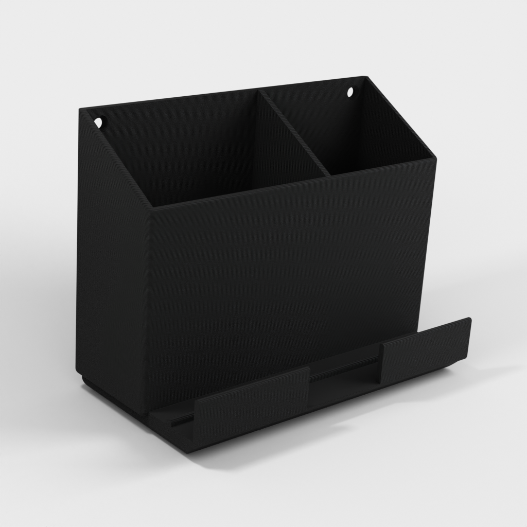 Vægmonteret fjernstyringsholder med plads til to fjernbetjeninger og en mobiltelefon. Den største holder er ideel til AC-controllere og den mindre er perfekt til TV-controllere. Produktet tilbyder også en handy holder på forsiden til din telefon. Desuden inkluderer dette produkt en Freecad-fil, hvilket gør det nemt at ændre positionen af skillelinjen eller fuldstændigt fjerne den.