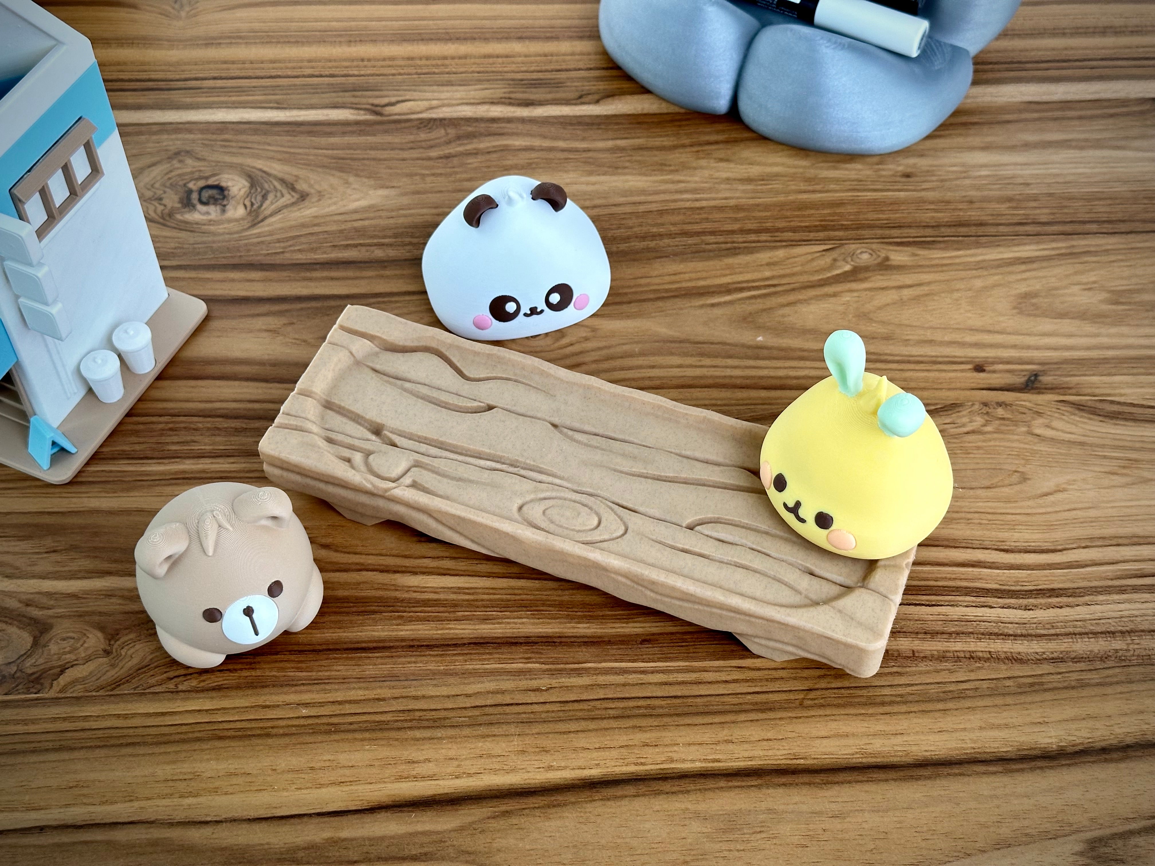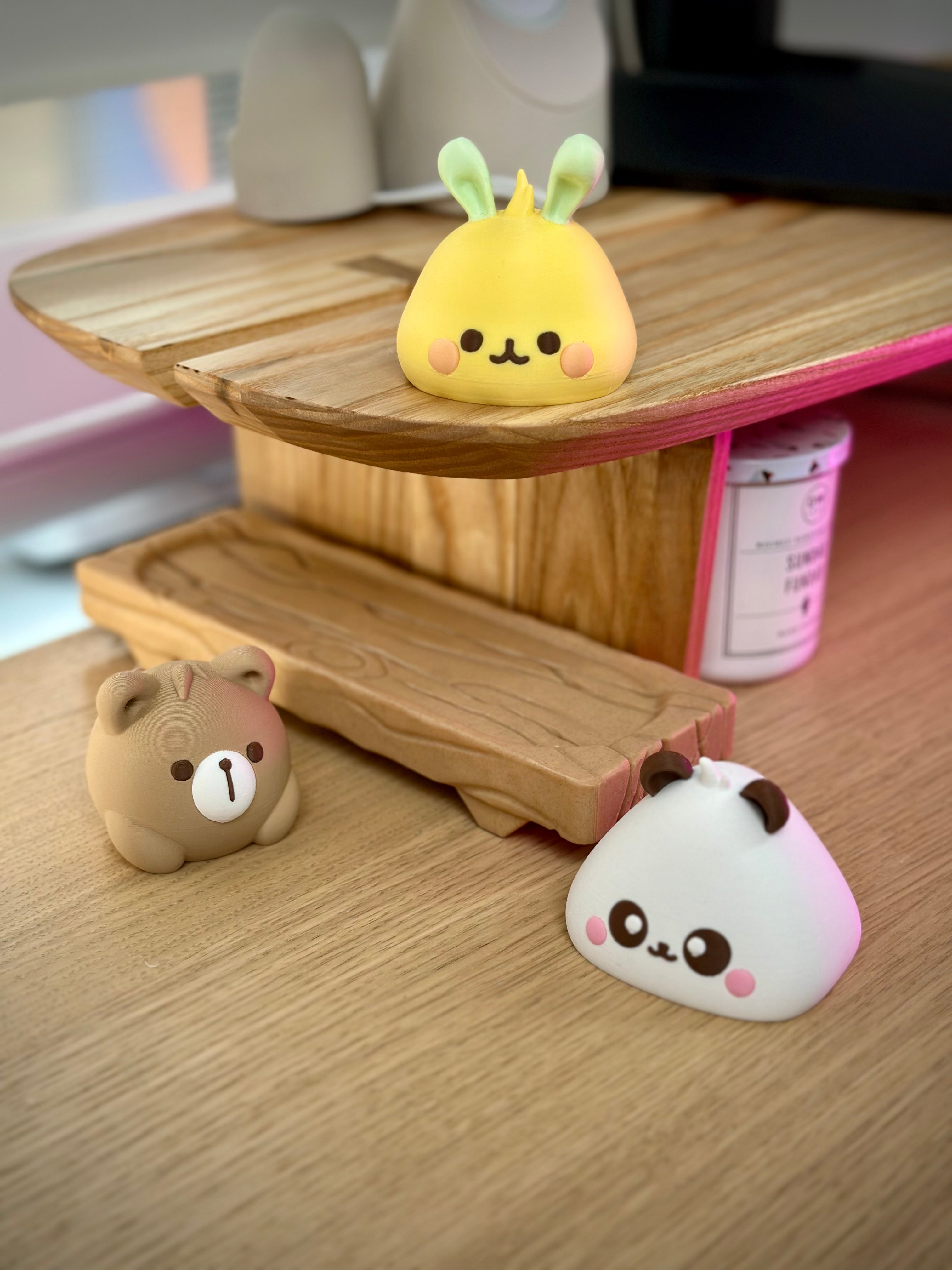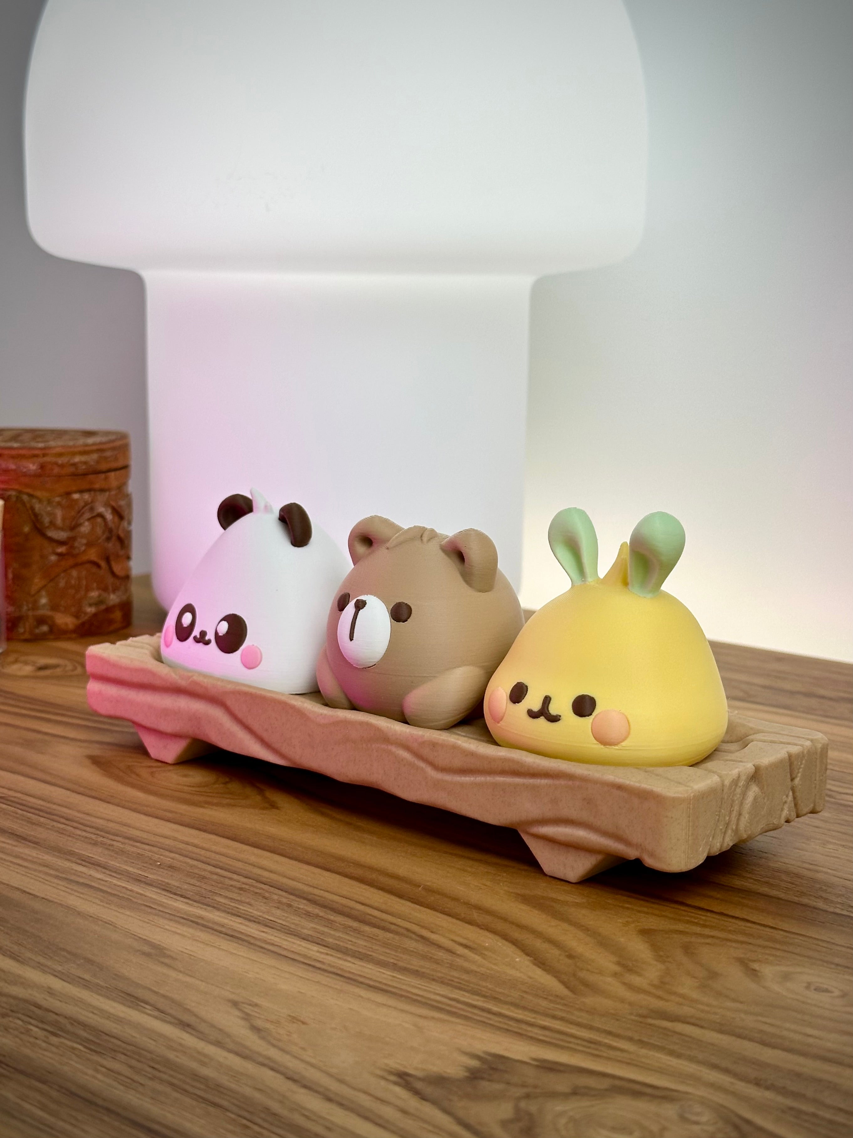 - Et charmerende sæt bestående af tre nuttede dyre-bao-figurer: en kanin, en panda og en bjørn.