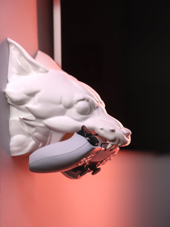 - Stilfuld controller stand udformet som et detaljeret ulvehoved.