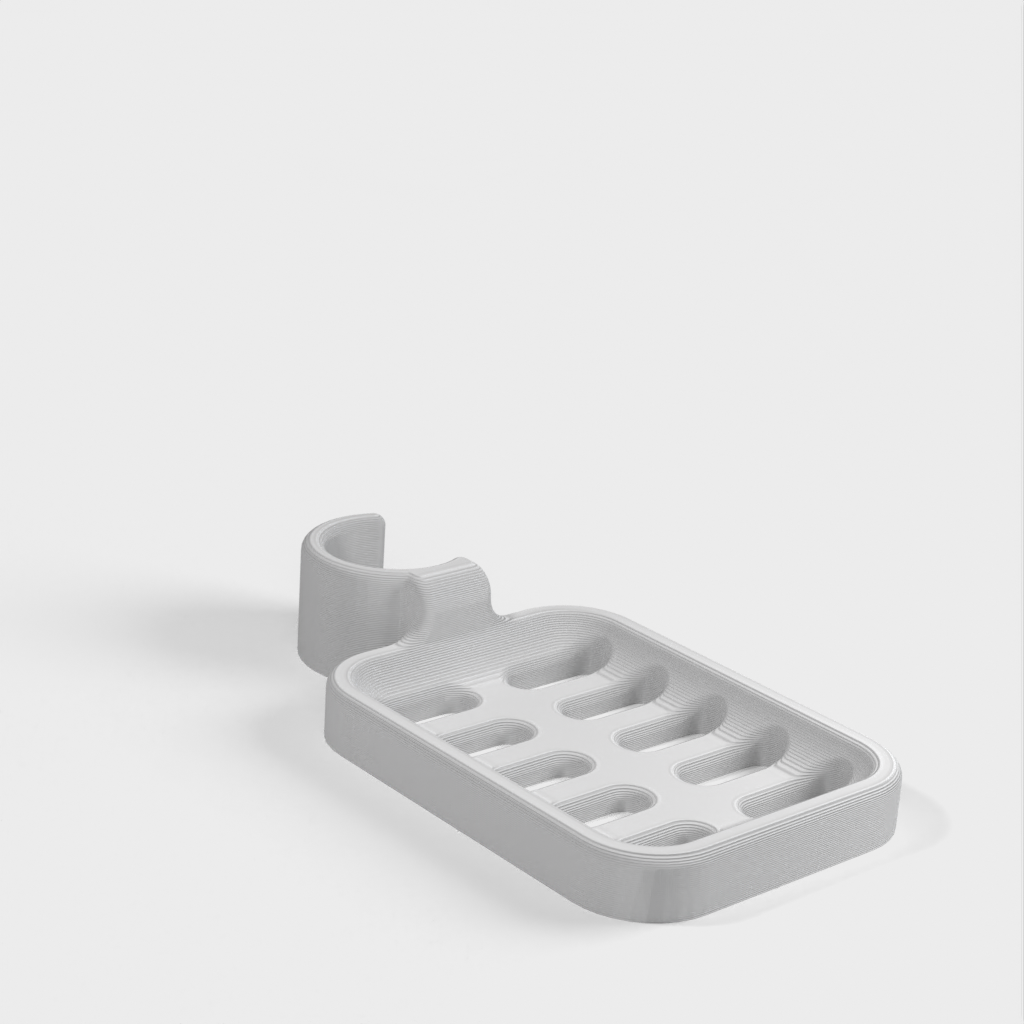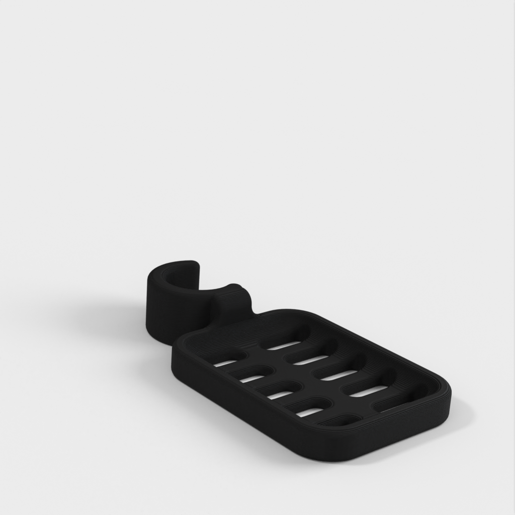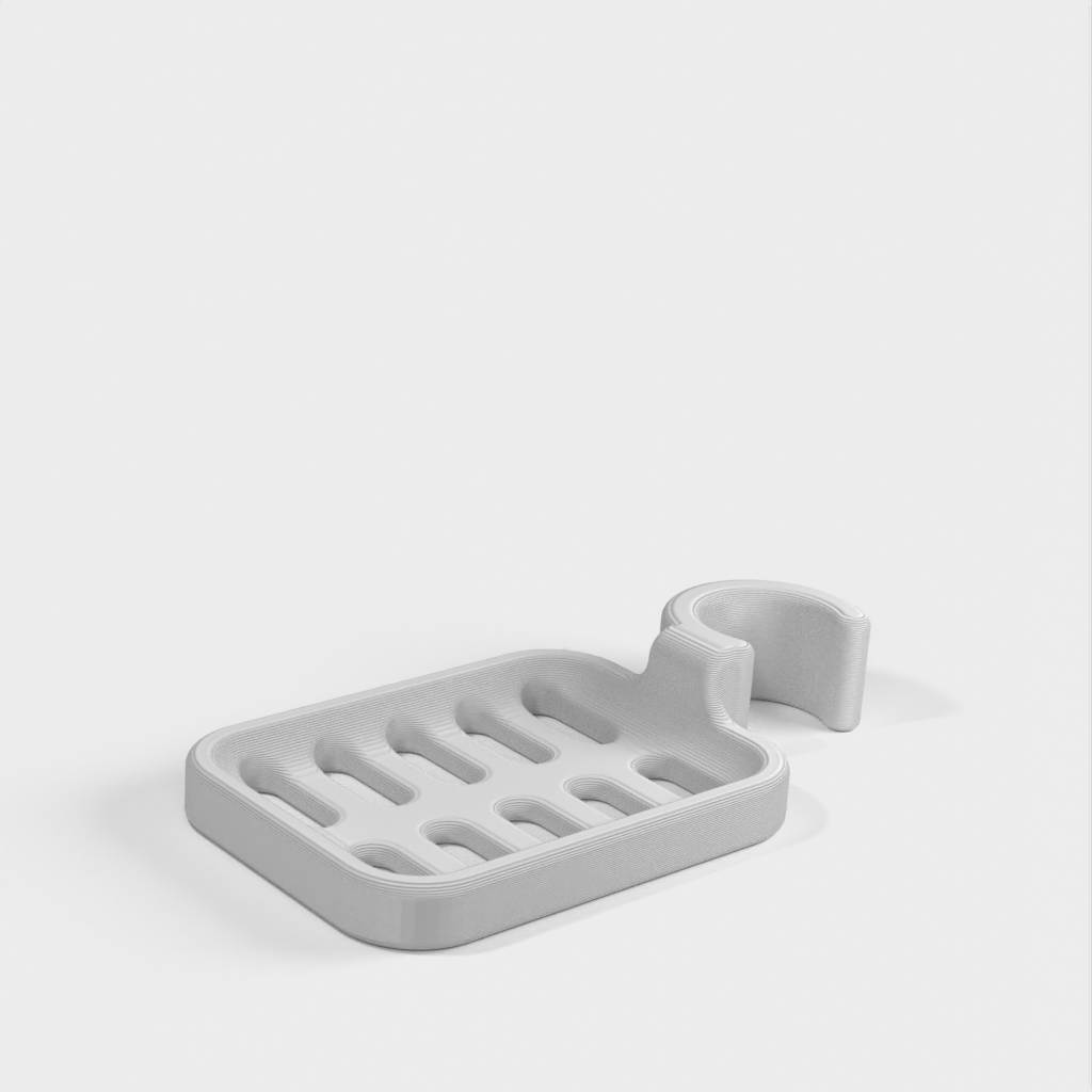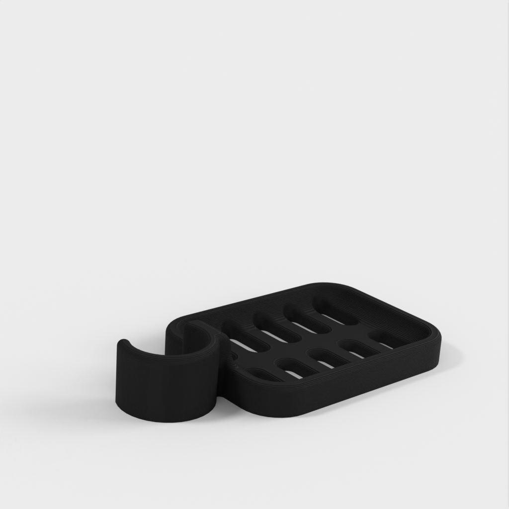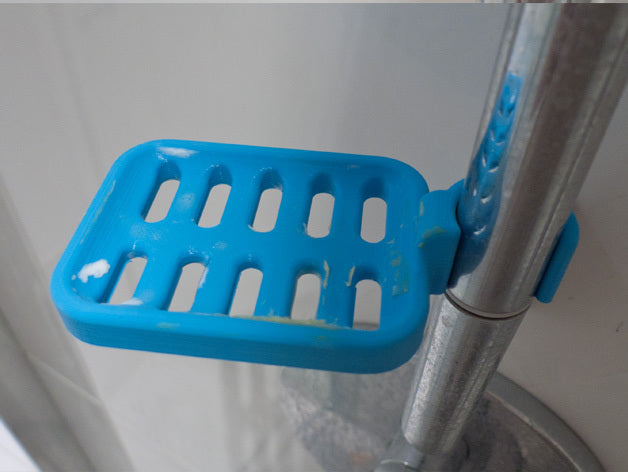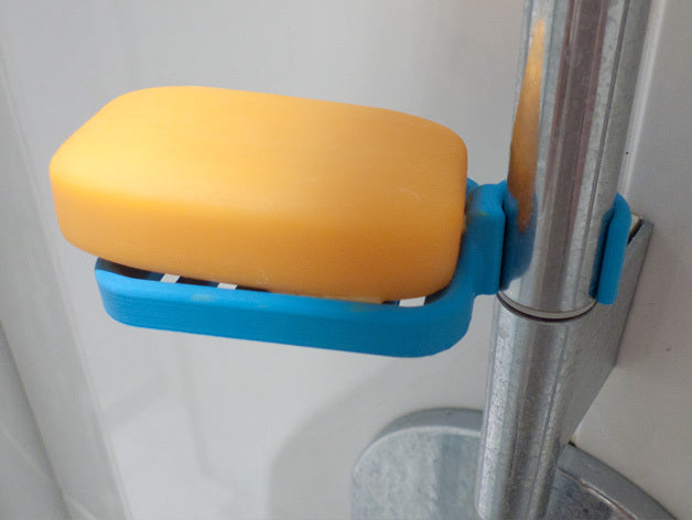 Duschsåphållare designad för att klämmas fast på duschstången. Såphållaren är speciellt designad för att passa på en rund stång med en diameter på 21,9mm. Tänk på att såphållaren är lite mindre i storlek. Det rekommenderas inte att använda PLA om möjligt, eftersom kroken riskerar att brytas ner efter en tid, särskilt i duschmiljö. ABS-plast rekommenderas som mer hållbart material för denna produkt.