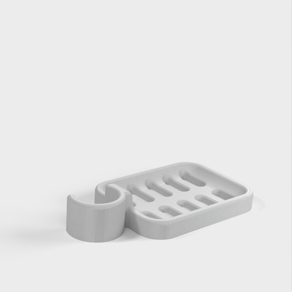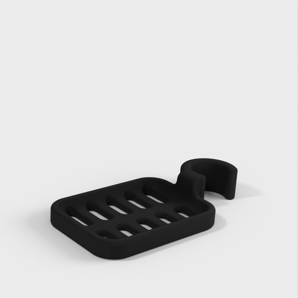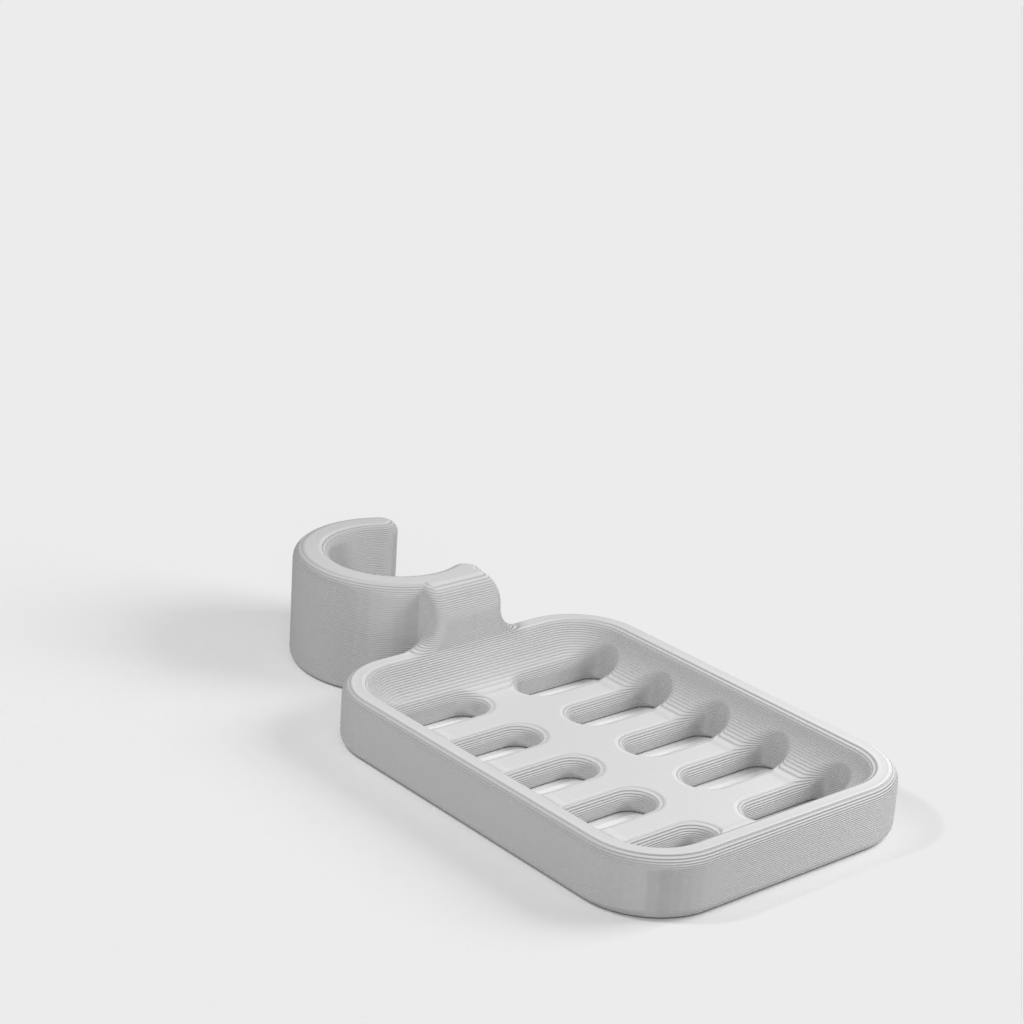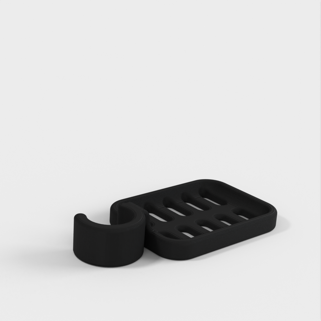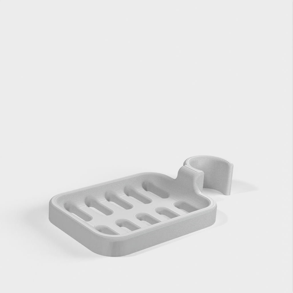 Duschsåphållare designad för att klämmas fast på duschstången. Såphållaren är speciellt designad för att passa på en rund stång med en diameter på 21,9mm. Tänk på att såphållaren är lite mindre i storlek. Det rekommenderas inte att använda PLA om möjligt, eftersom kroken riskerar att brytas ner efter en tid, särskilt i duschmiljö. ABS-plast rekommenderas som mer hållbart material för denna produkt.