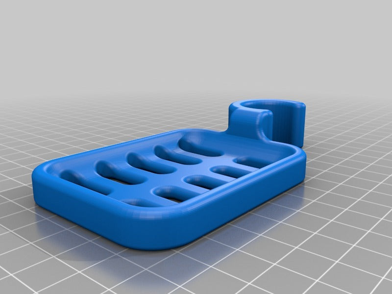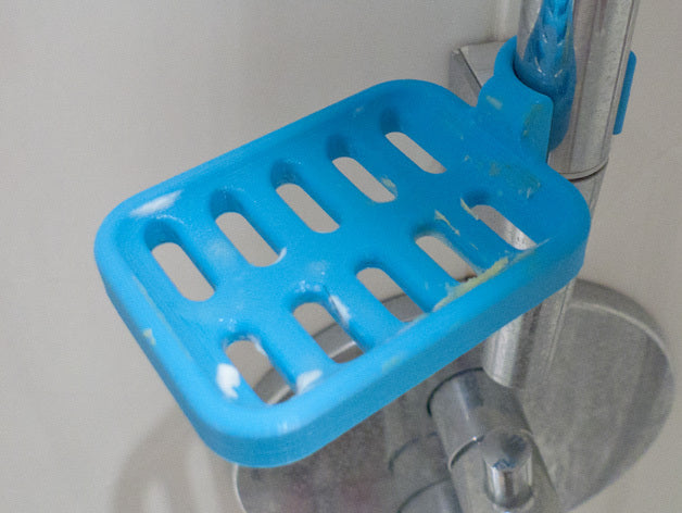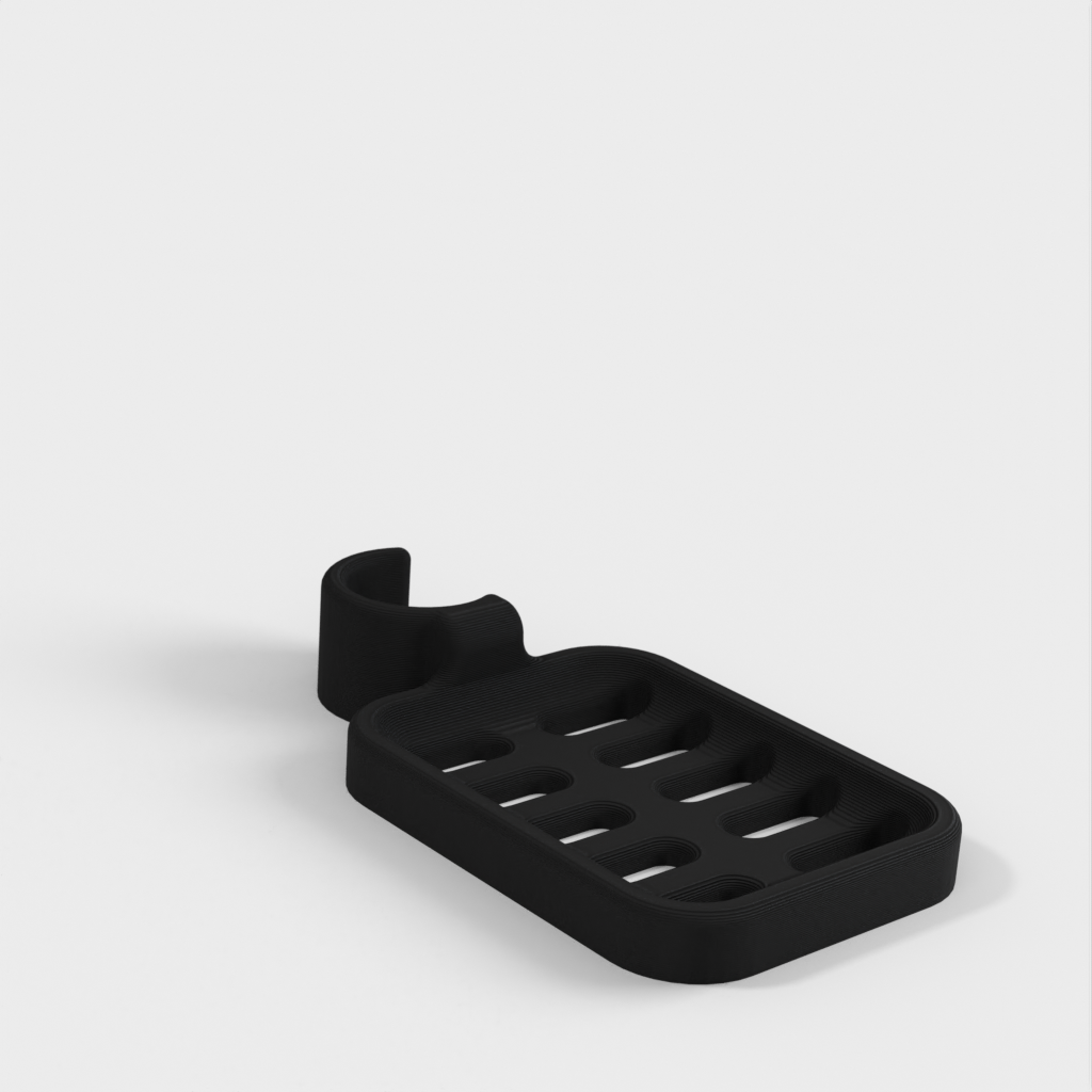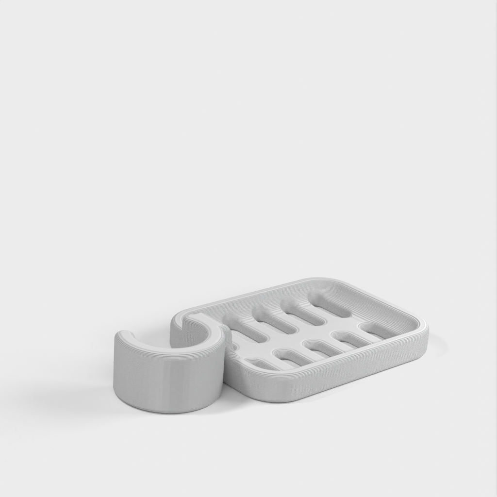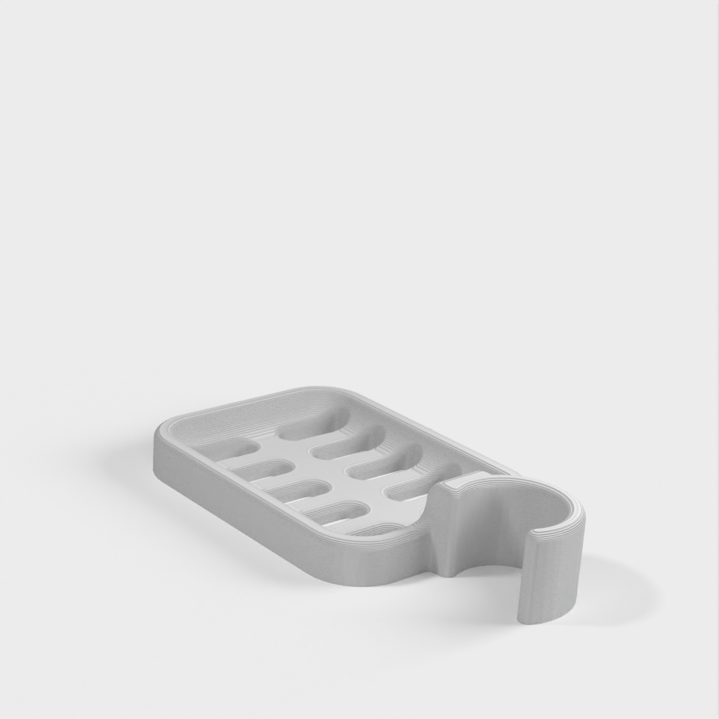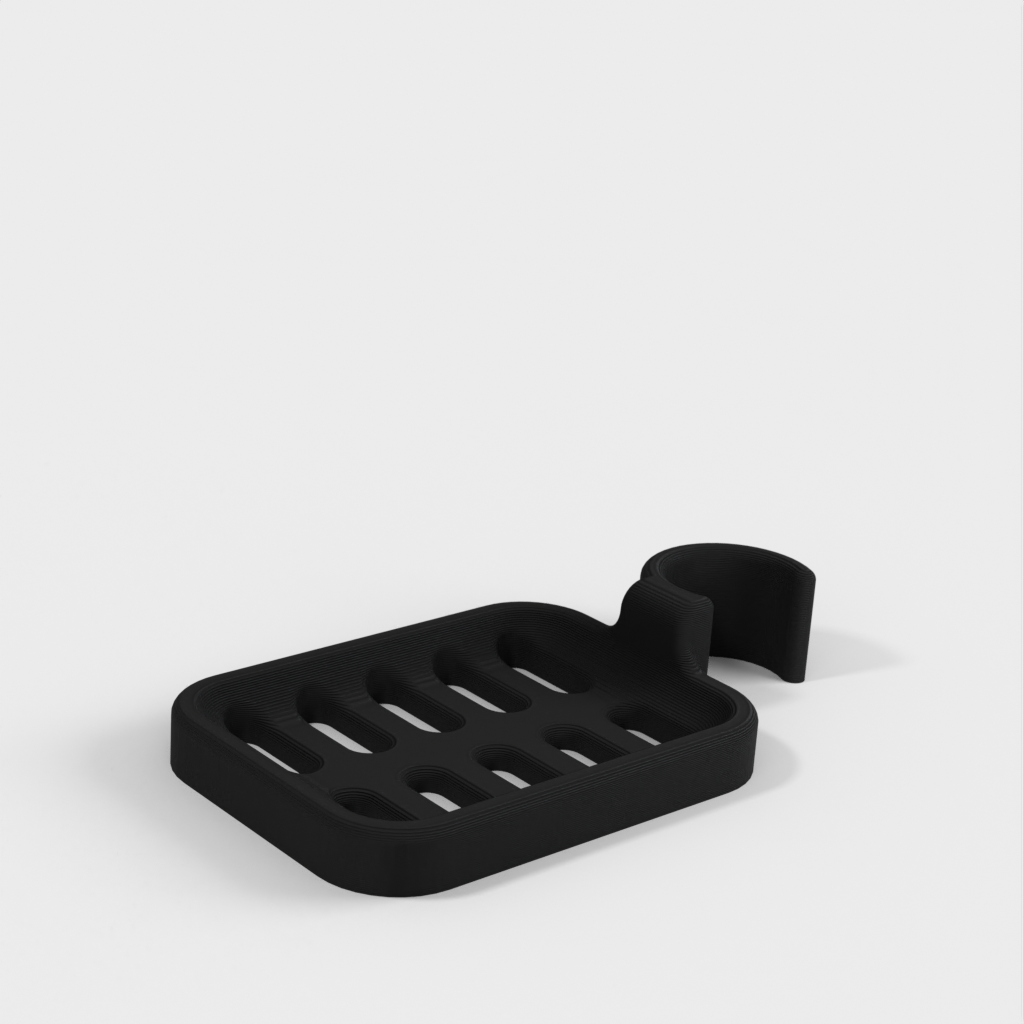 Duschsåphållare designad för att klämmas fast på duschstången. Såphållaren är speciellt designad för att passa på en rund stång med en diameter på 21,9mm. Tänk på att såphållaren är lite mindre i storlek. Det rekommenderas inte att använda PLA om möjligt, eftersom kroken riskerar att brytas ner efter en tid, särskilt i duschmiljö. ABS-plast rekommenderas som mer hållbart material för denna produkt.