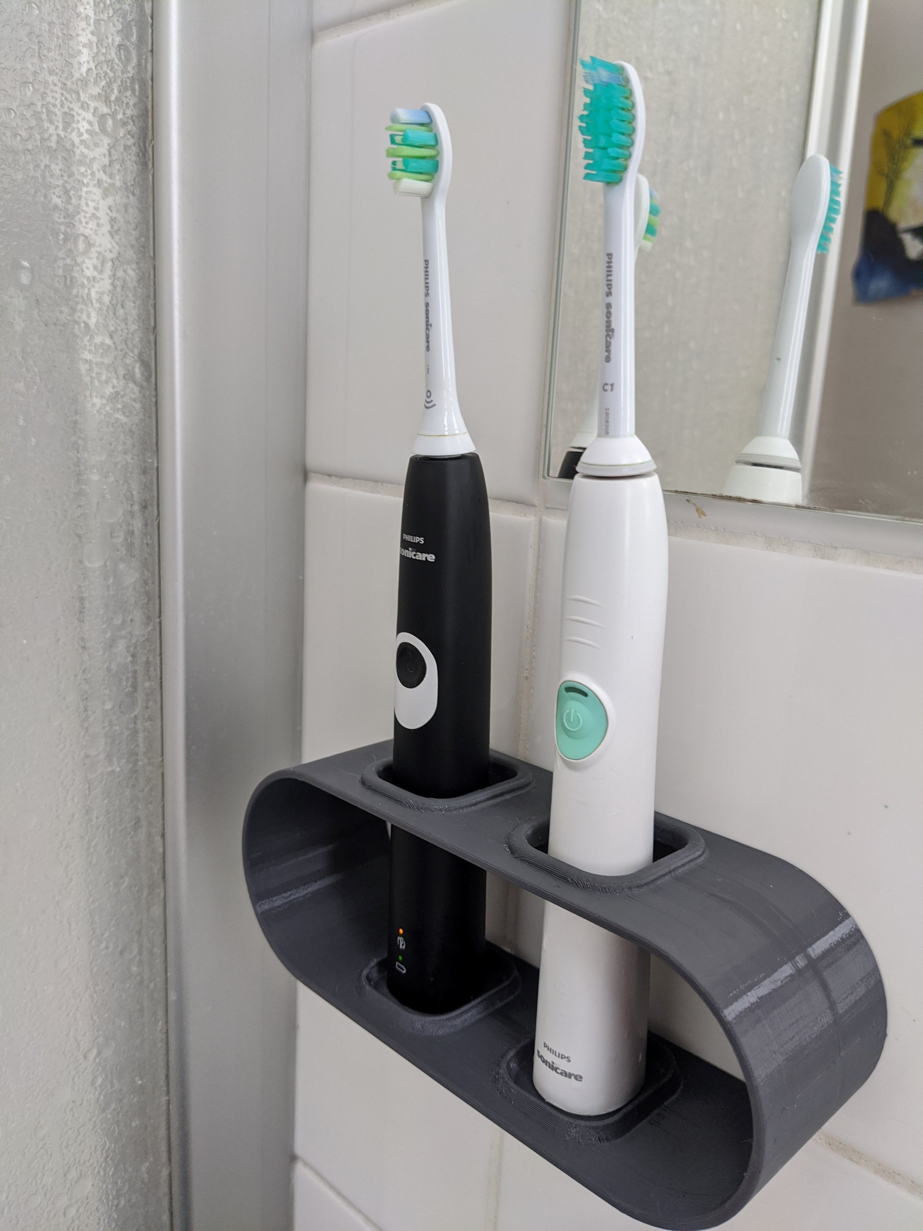 Elektrisk tandbørsteholder designet til at holde to tandbørster (Philips Sonicare). Denne holder kan nemt monteres på enhver overflade ved brug af dobbeltsidet monteringstape. En enkel og praktisk løsning til at holde dine elektriske tandbørster organiserede og let tilgængelige.