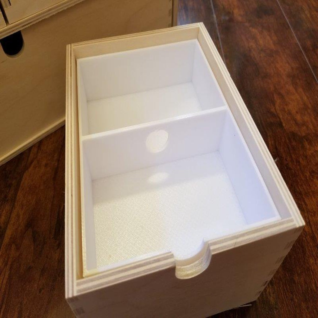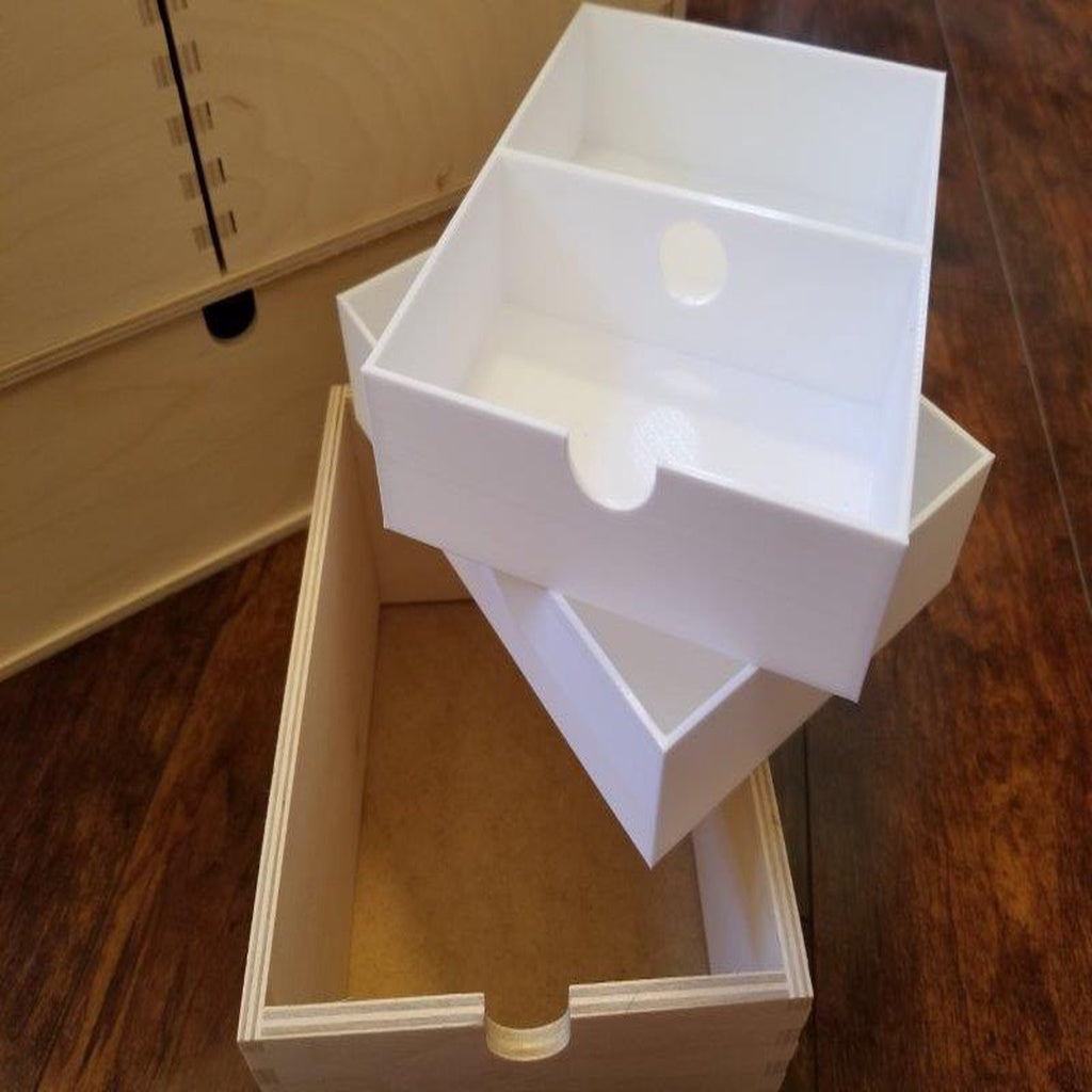 Dette er indsatsorganisatorer til Ikea MOPPE-skuffer. Disse passer i de mindre skuffer af Moppe-organisatoren. Bunden og toppen er identiske, undtagen den øverste, der har en hak til skuffetræk.