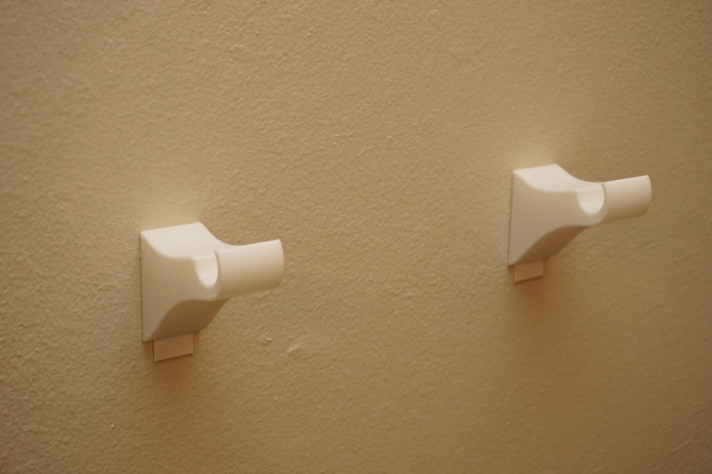 Dette er en enkel vægholder til en Ikea MULIG tørrestativ (Artikelnummer: 502.287.55). Den er konstrueret til at blive fastgjort til væggen ved hjælp af dobbeltklæbende tape (eller i mit tilfælde Command Strips). Jeg bruger to for at holde mit stativ ude af syne bag en dør, der normalt står åben.