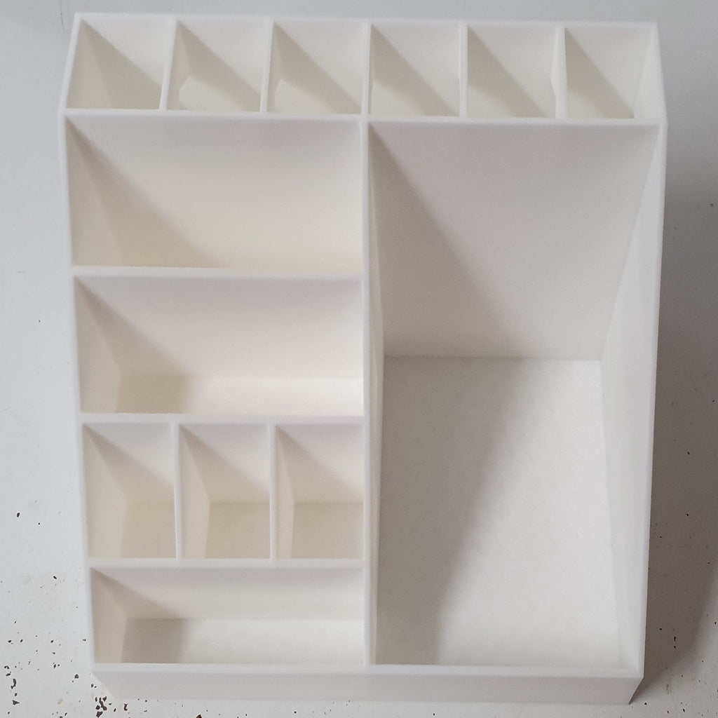 En praktisk makeup holder med skillevægge, der gør det nemt at organisere dine børster og andet makeup-udstyr. Denne holder vil hjælpe dig med at holde dit bord eller badeværelseskab pænt og ryddeligt, mens dine produkter altid er inden for rækkevidde. En perfekt tilføjelse til dit hjem!