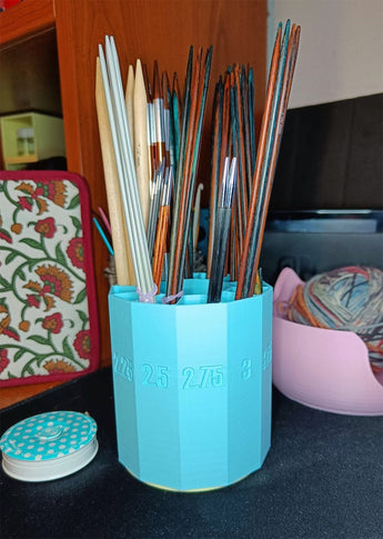 Der er en version med strikkepinde-størrelse indgraveret på hvert ydre rum, men den er lavet med de nålstørrelser, jeg har, så du vil måske gerne tilpasse det med forskellige størrelser. Jeg tilføjede også .f3d-filen, hvis du vil ændre det for at passe til dit behov.