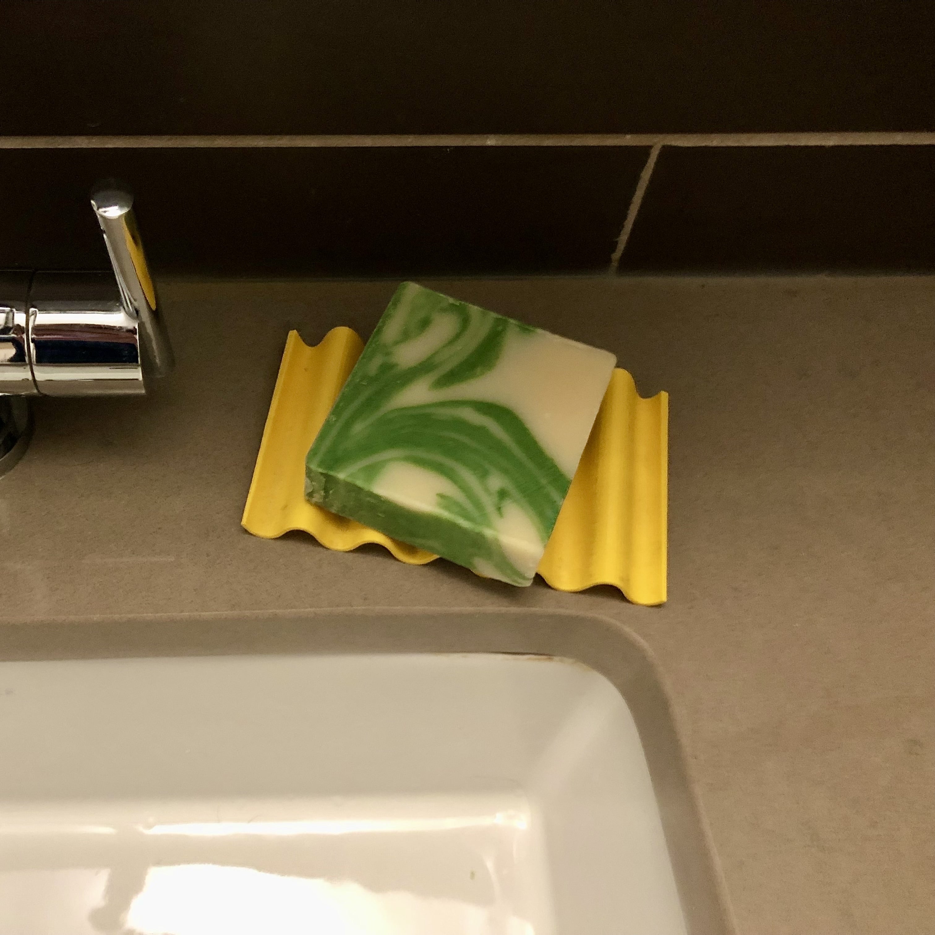Dette er en praktisk sæbe skål, med et print på siden, som er designet til at holde din sæbe eller svamp. Ingen ekstra støtte er nødvendig.