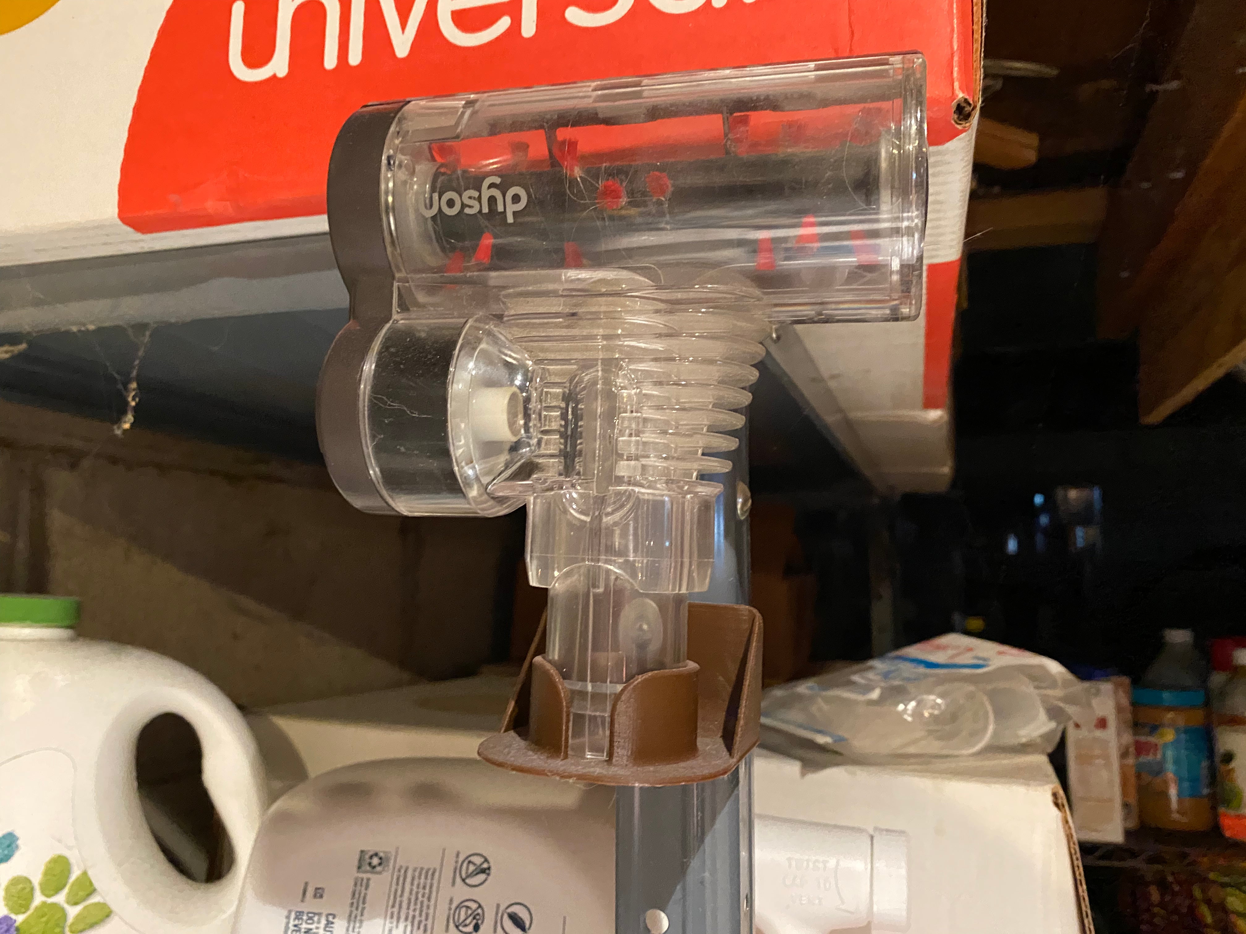 Dette er en vægmonteret holder til et enkelt Dyson støvsuger værktøj. Jeg købte støvsuger tilbehøret, der kommer med Dyson Animal, men støvsugeren havde ikke nogen ombord opbevaring til den, og jeg bruger den ikke så ofte, så jeg opbevarer den i kælderen.