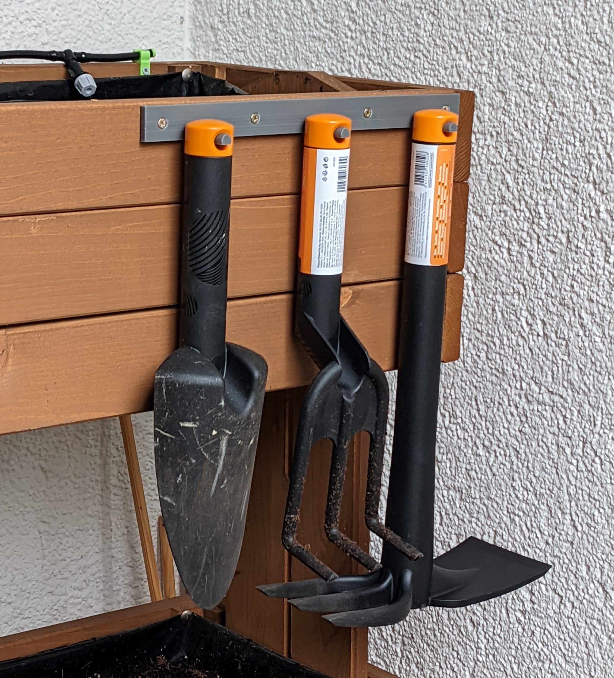 Dette er en vægholder til Fiskars haveværktøj. Holderen kan monteres direkte på en væg med 4 skruer. Fiskars haveværktøj kan så nemt placeres i holderen, hvilket gør din værksted, skur eller arbejdskøretøj mere ryddeligt.