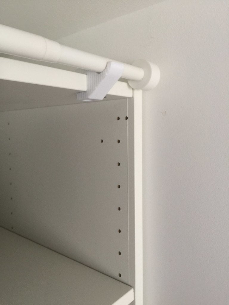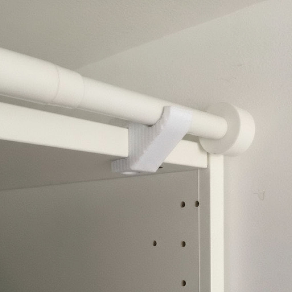 Dette er en gardinstangsstøtte uden behov for boring. Den er designet til at passe til en IKEA-skabs tykkelse og tillader let montering af din gardinstang uden brug af skruer. Den passer til skabe med en tykkelse på 18mm.