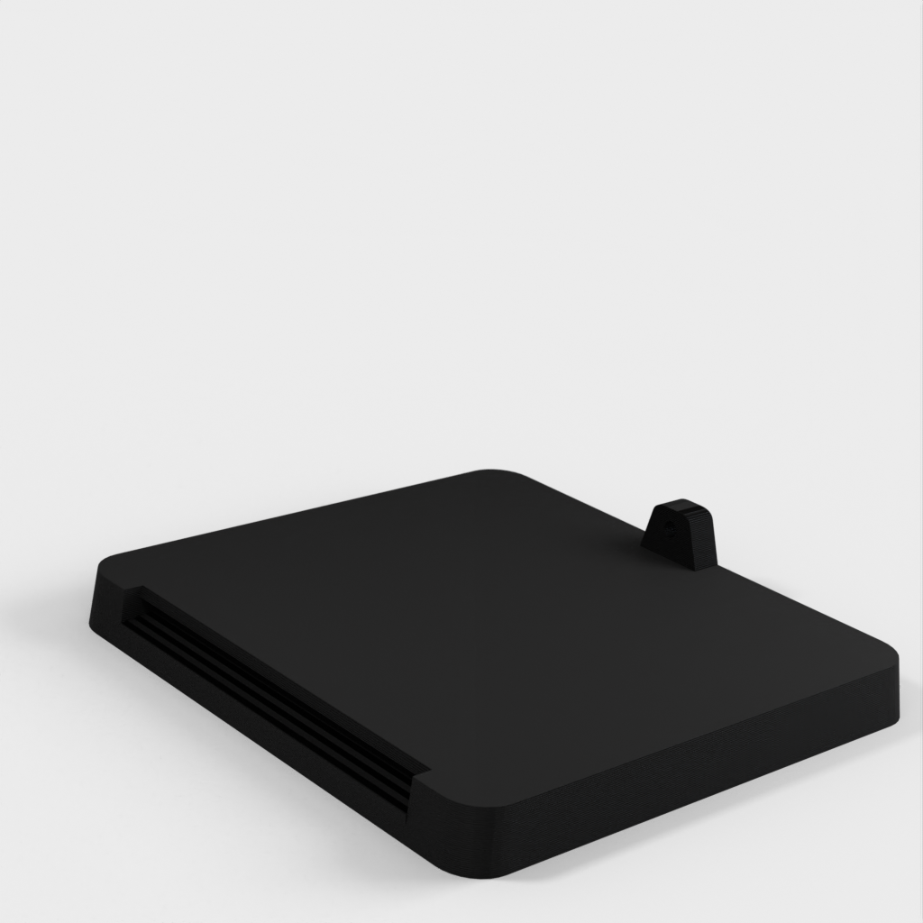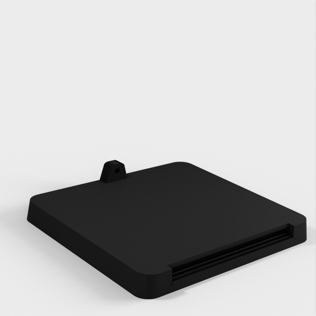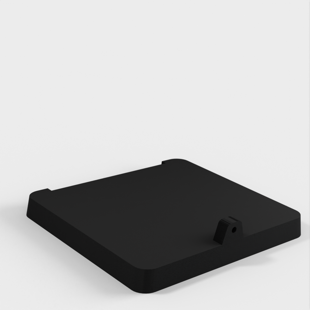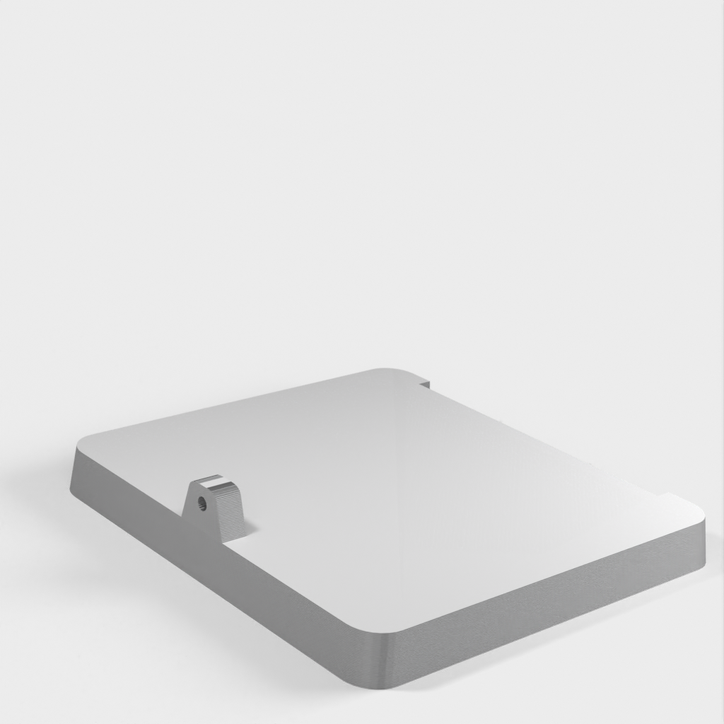 Dette er en Eufy Solar Wall Light Cam S120 kameramount. Den leveres med en tyndvægs plastikhænger designet til at blive brugt med tre skruer. Da boring ind i mine betonbelagte vægge ikke var praktisk, genskabte jeg monteringen med store puder på bagsiden for at fungere med dobbeltsidet tape.