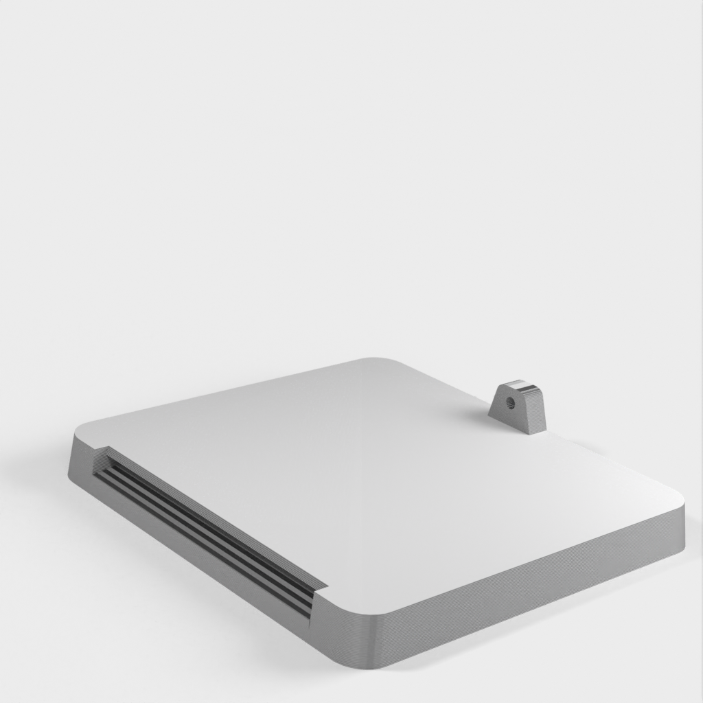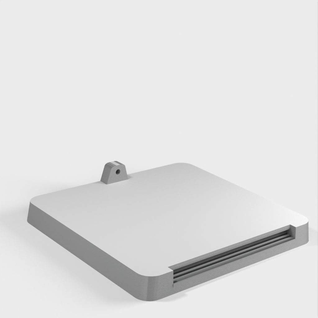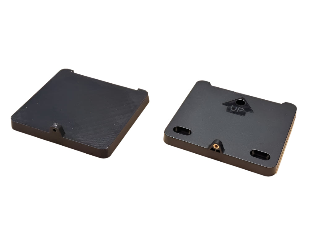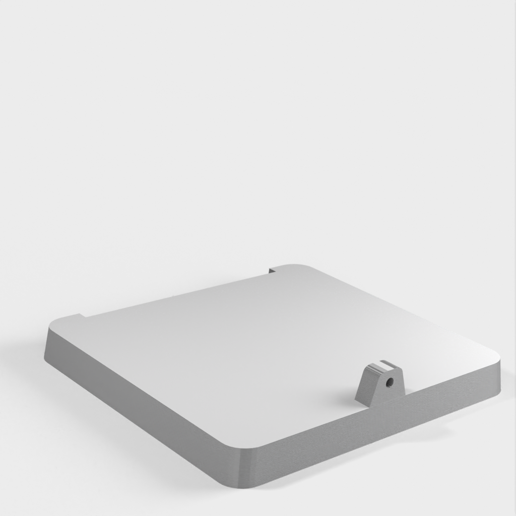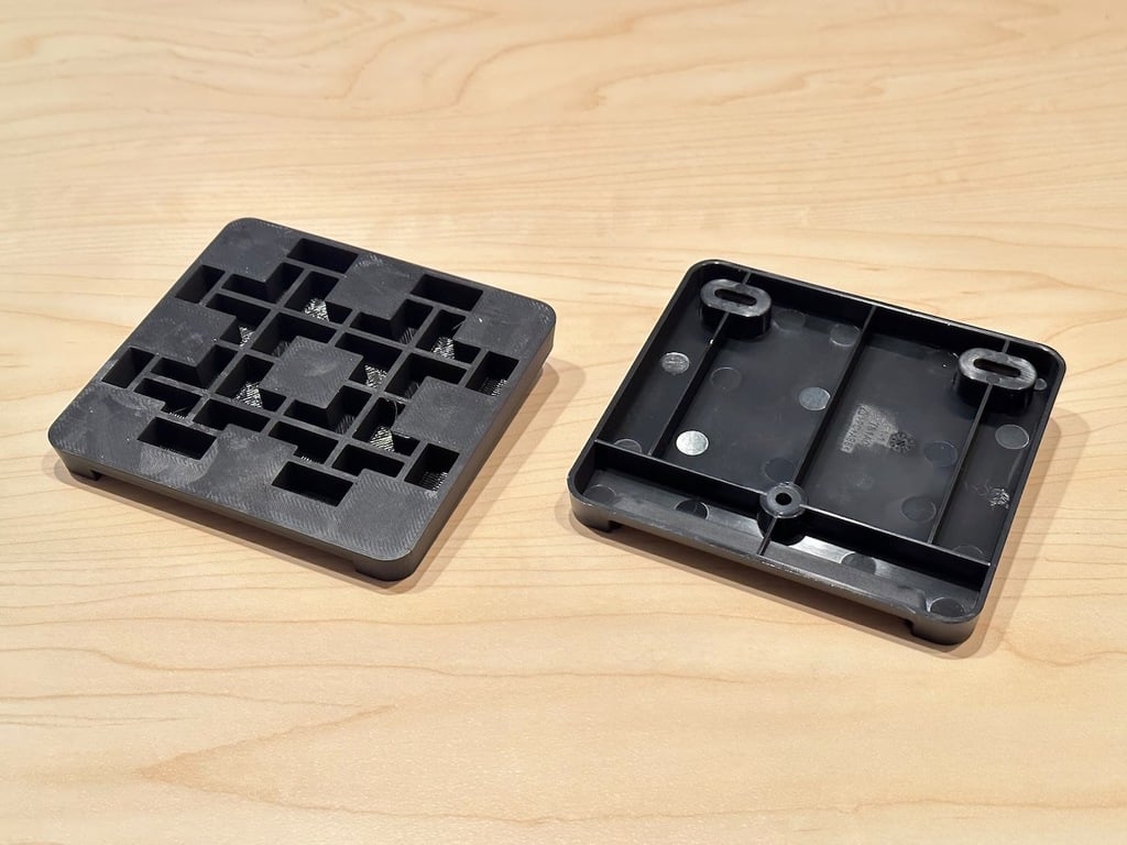 Dette er en Eufy Solar Wall Light Cam S120 kameramount. Den leveres med en tyndvægs plastikhænger designet til at blive brugt med tre skruer. Da boring ind i mine betonbelagte vægge ikke var praktisk, genskabte jeg monteringen med store puder på bagsiden for at fungere med dobbeltsidet tape.