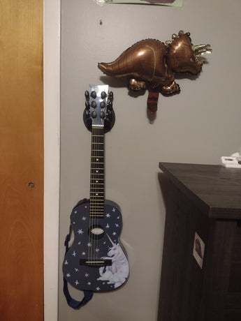 Ved at bruge dette vægbeslag frigøres gulvplads, og instrumentet er let tilgængeligt, når det skal bruges. Det robuste design er passende for forskellige guitarhalse og er ideelt til musikrum, børneværelser eller som en dekorativ løsning, der kombinerer funktionalitet med et sjovt udtryk.