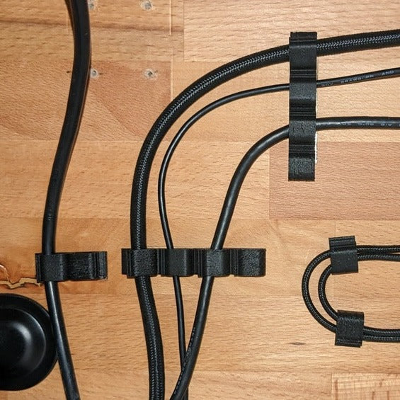 Kabelstyringsclips til brug med dobbeltsidet tape.