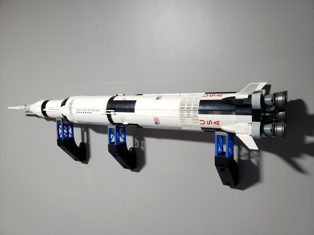 Vægmonteret stativ til Lego Saturn V model. Den har funktioner til at holde Lego aksler, der forbinder den blå stand, der kommer med modellen. Perfekt til at vise din Lego Saturn V model på væggen.