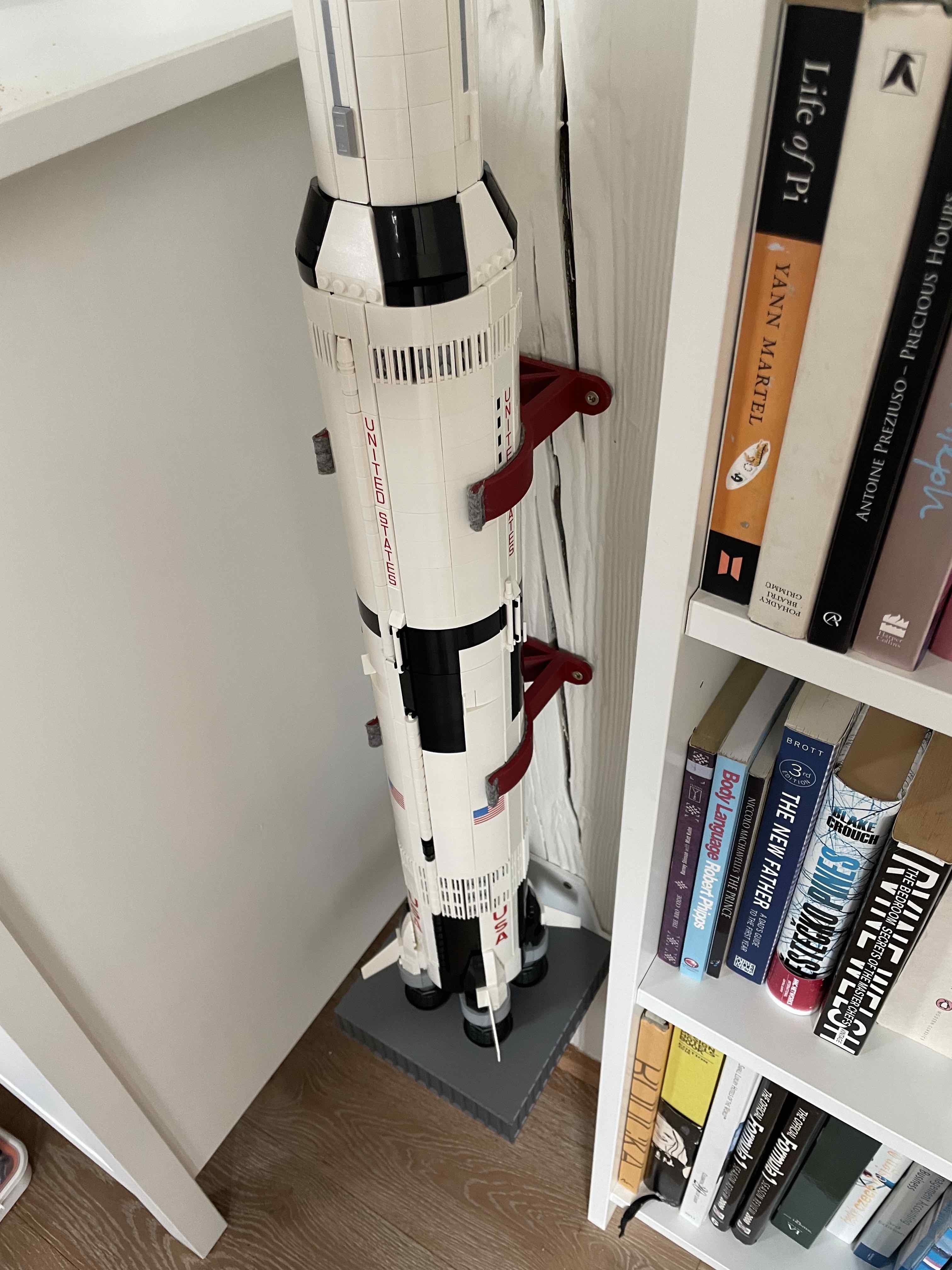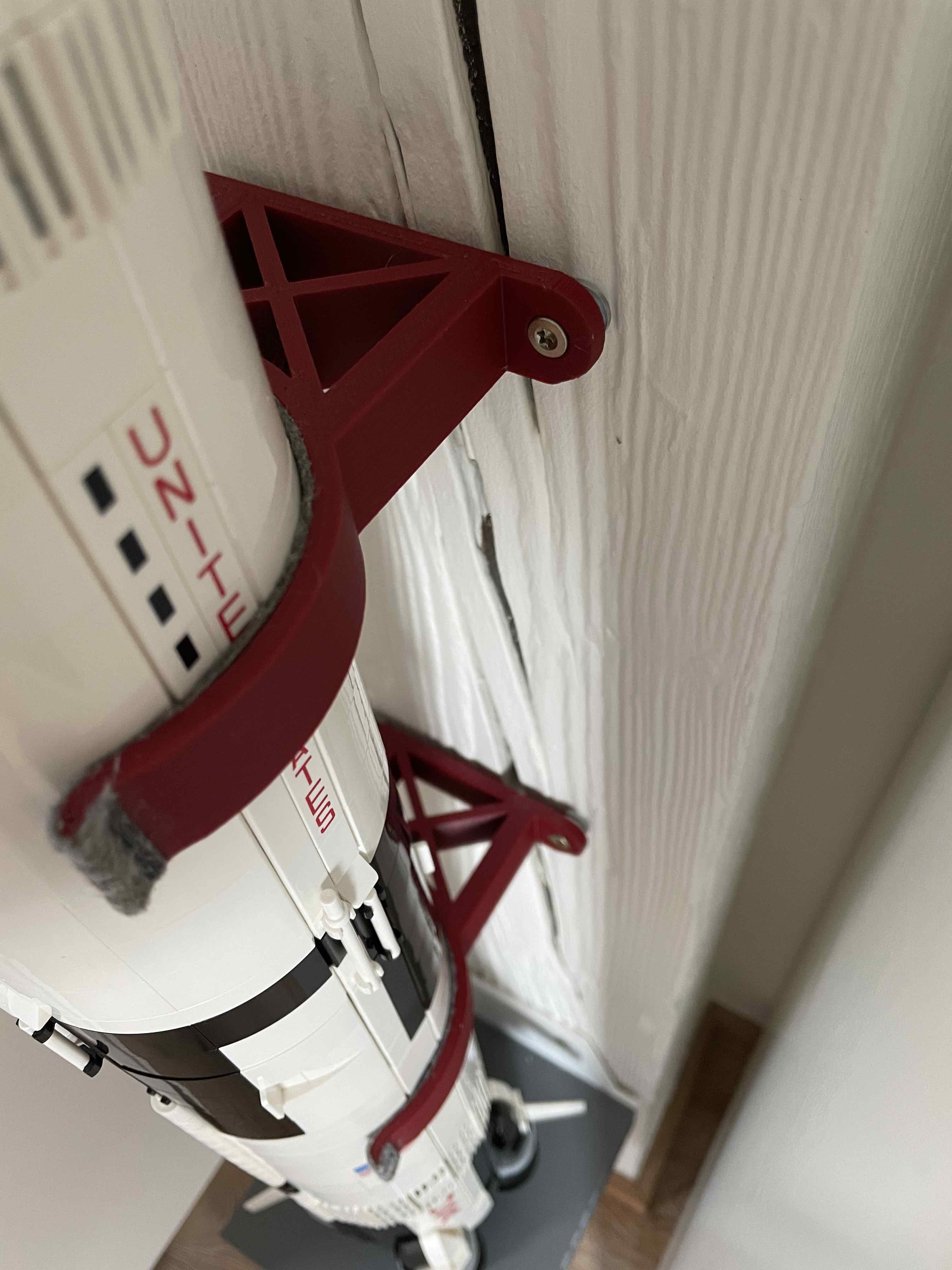 Dette er en vægmontering til en LEGO Saturn V model. Monteringen er let at installere med tre skruer til forstærkning. Monteringens design er inspireret af det faktiske affyringsanlæg, men er forenklet for at muliggøre nem printning.