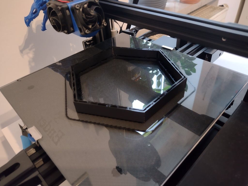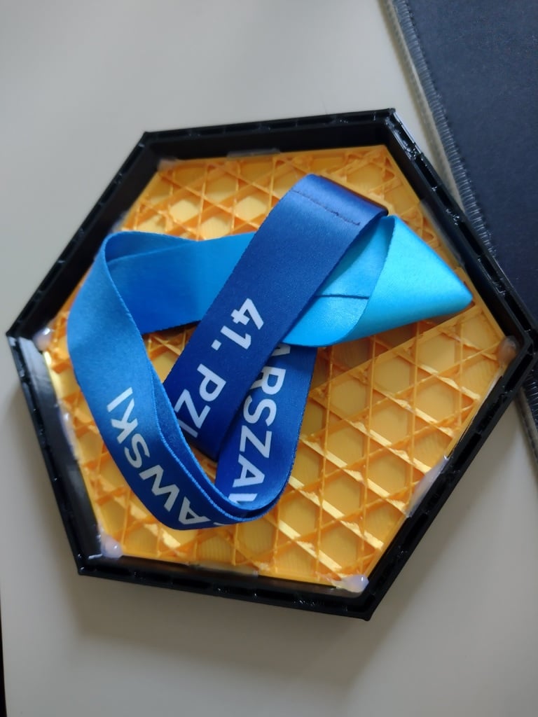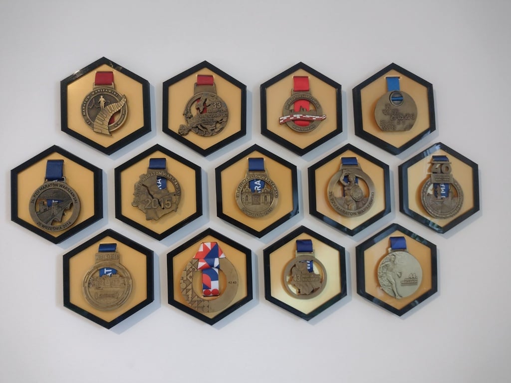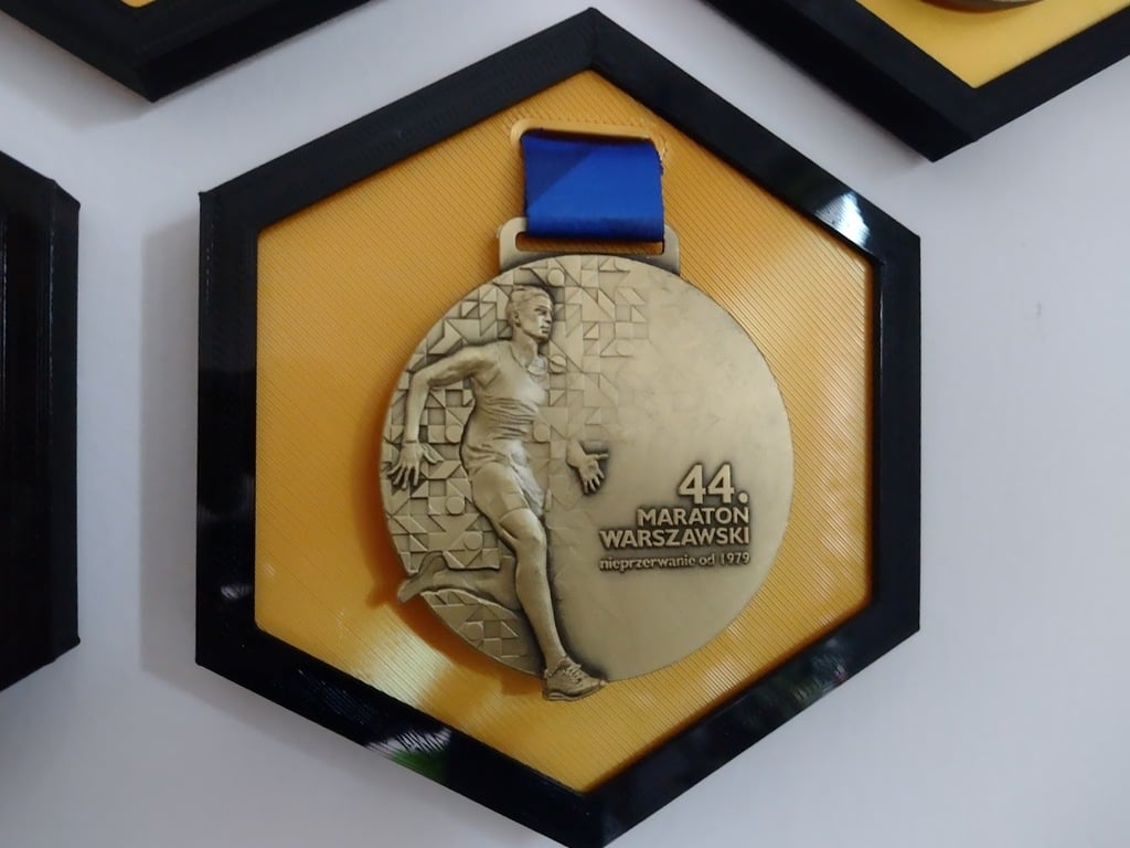 Dette er en todelt (tofarvet) sekskantet medaljeholder/ramme til at udstille dine medaljer pænt på væggen. Takket være den sekskantede form kan medaljer arrangeres på en symmetrisk og flot måde.