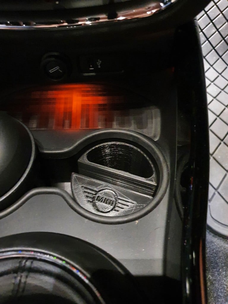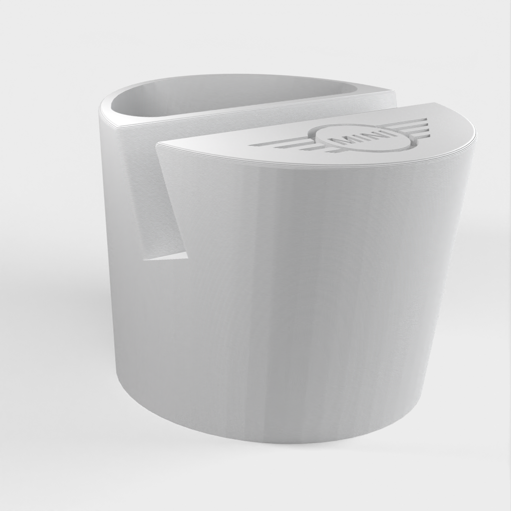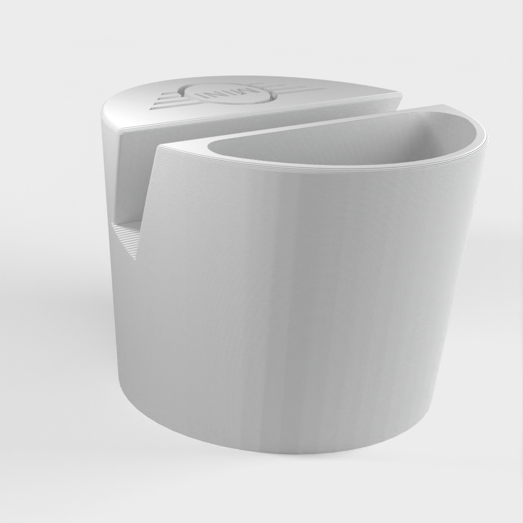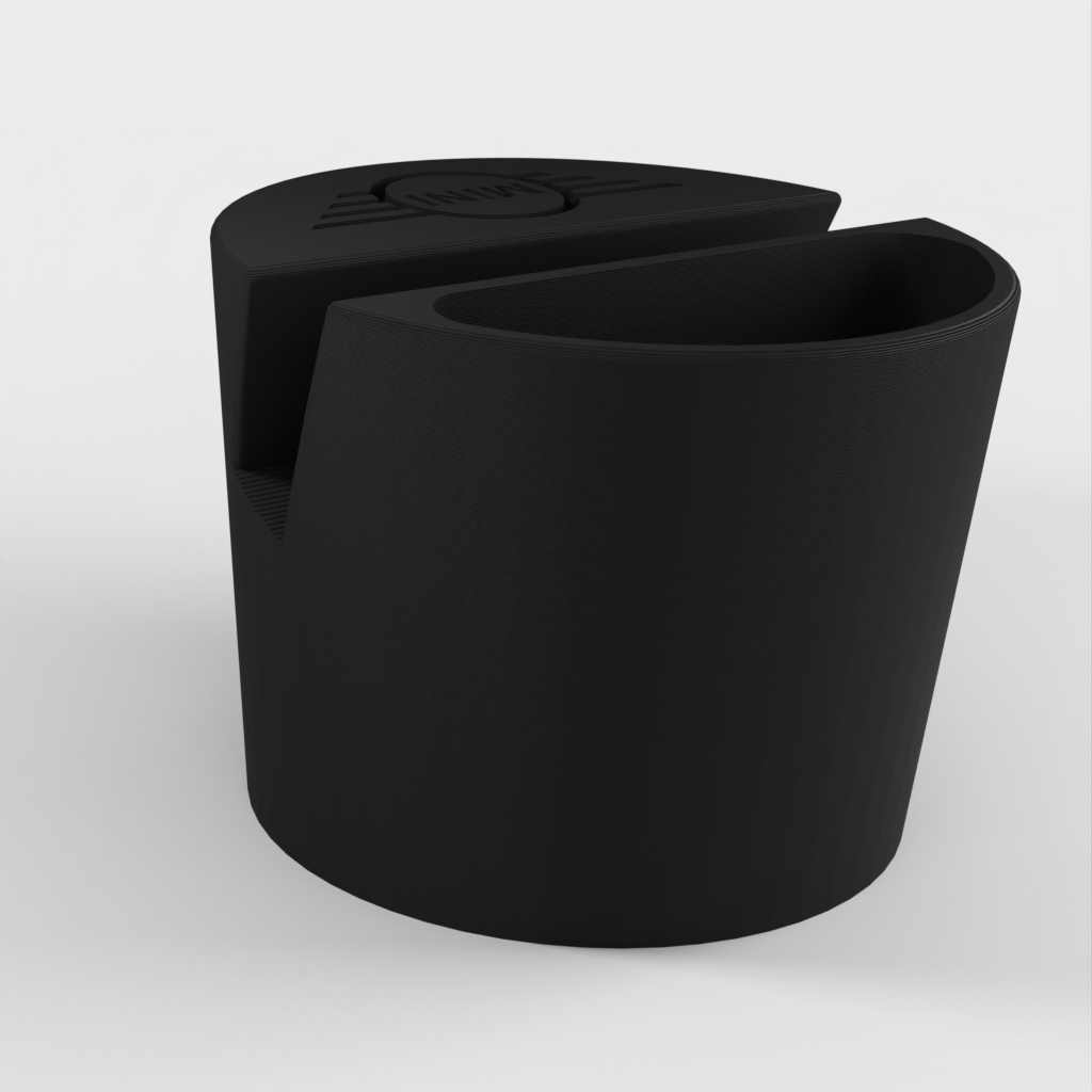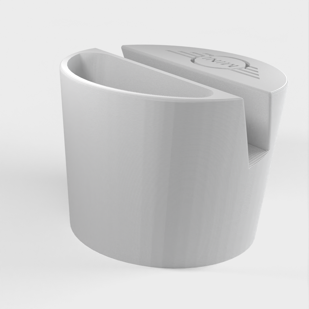 Telefonholder til en Mini Cooper bil, der er designet til at passe i kopholderen. Telefonholderen kan rumme telefoner op til 11mm i tykkelse og 75mm i bredden. Med Mini-logo og en hulning til små objekter som fjernbetjeninger. Hjælper med at holde din bil organiseret og sikrer, at din telefon altid er inden for rækkevidde.