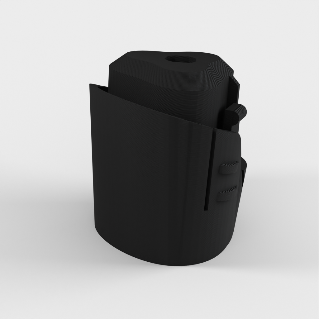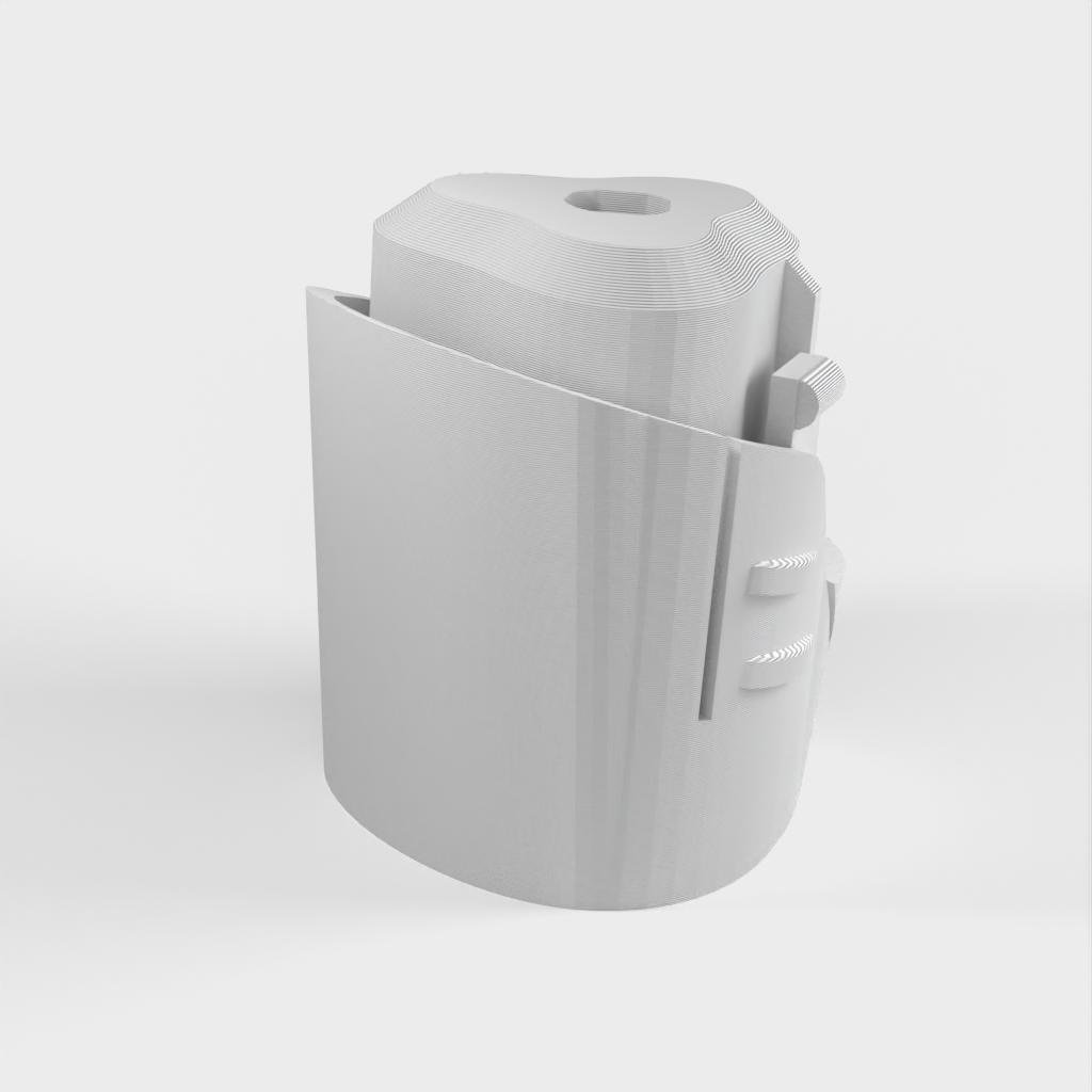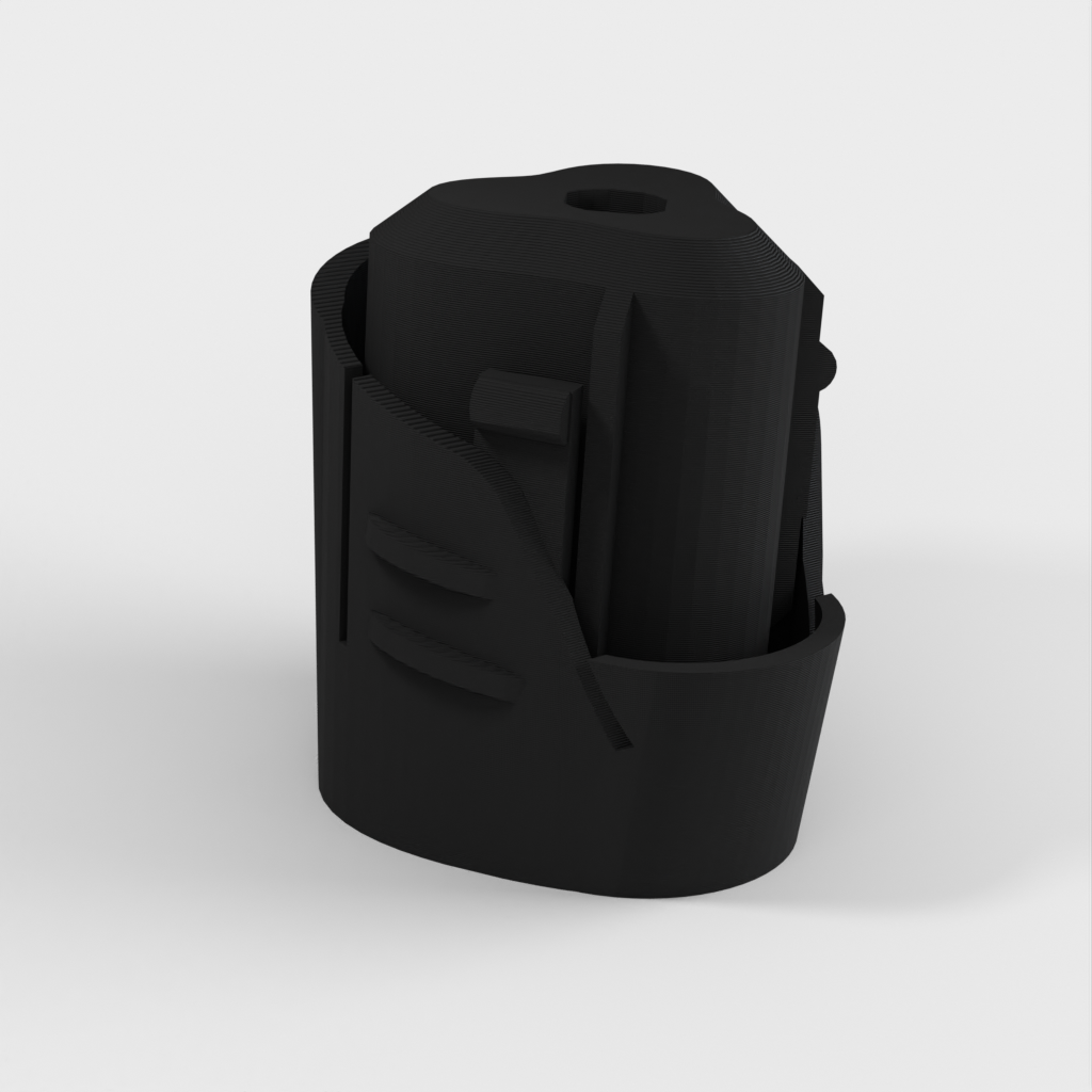 Simpelt vægophæng til et Milwaukee M12 værktøj. Ophænget benytter hullet til batteriet og værktøjet sættes derfor nemt op på ophænget.