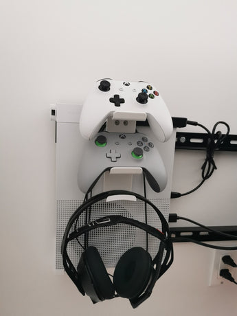 - Vægmonteret holder specielt designet til at holde en Xbox One controller og hovedtelefoner.