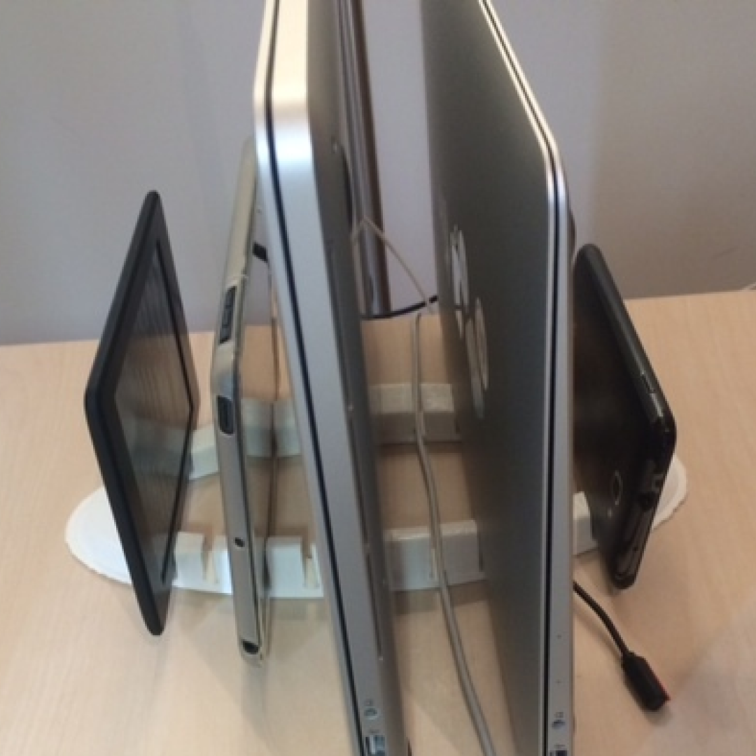 Lodret stativ til at holde 5 apple devices. F.eks. en Macbook Pro Retina 15, Macbook Air 13, Kindle Paperwhite, iPad og iPad mini. Har også kabelspor, så ladekablerne ikke flyver ud af skrivebordet, når du tager stikket ud.