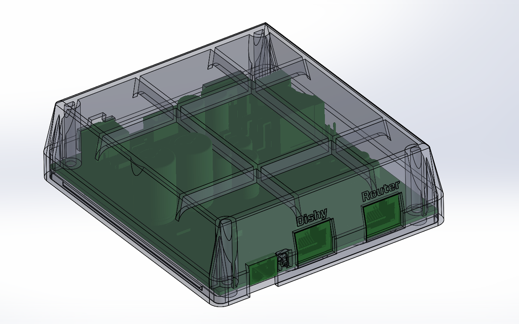Dette er en 3D-printet kasse til Starlink Dishy DC strømforsyning og PoE Injector. Kassen sikrer strømforsyningen godt og sikkert, samtidig med at den giver et pænt og stilrent udseende.