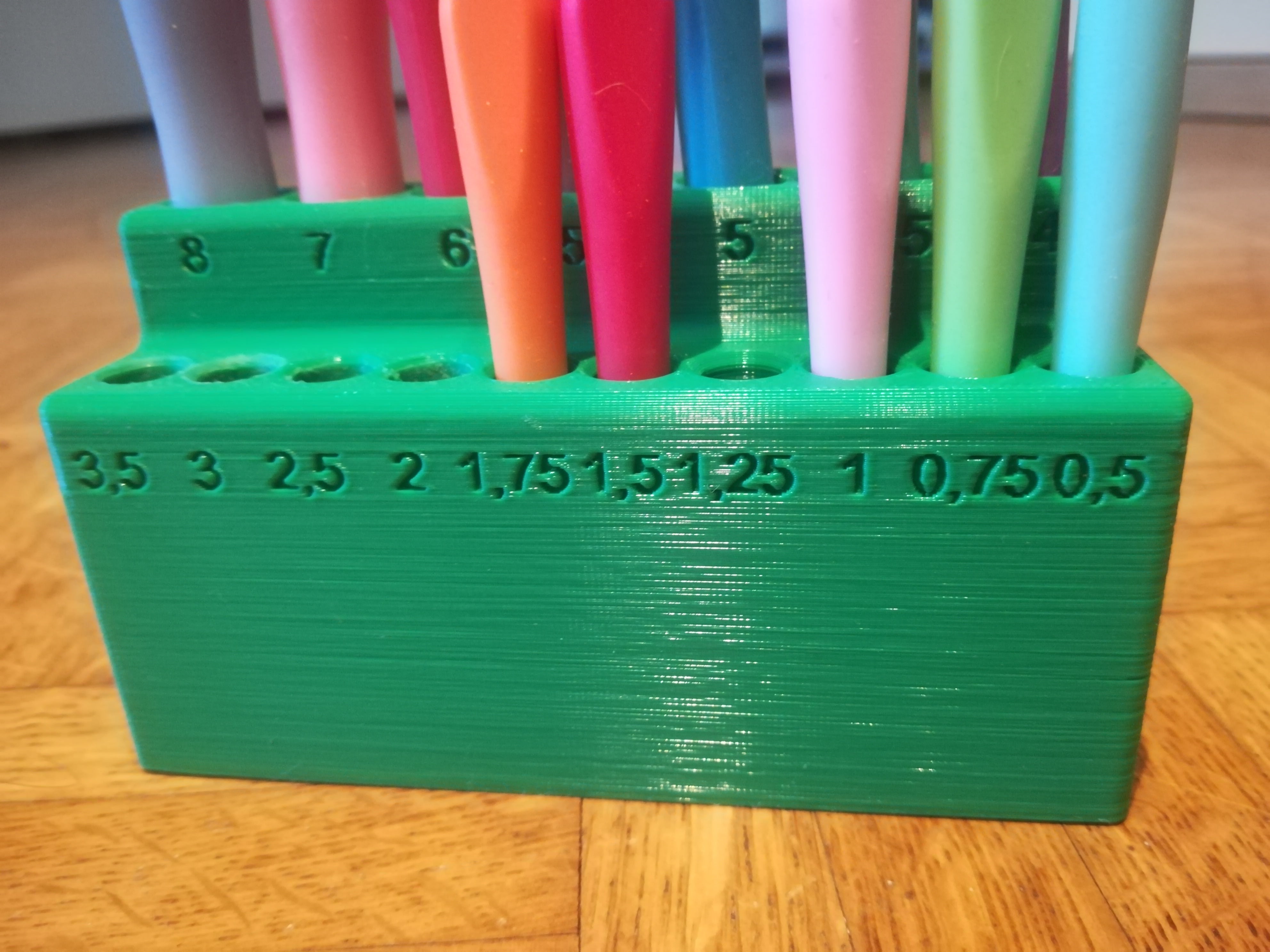 Denne holder er den perfekte løsning til opbevaring af dine yndlingscrochet-hæklepinde. Den kan rumme 17 forskellige størrelser af hæklepinde, hvilket gør det nemt at holde styr på dine værktøjer og hurtigt finde den rigtige størrelse til dit projekt. Med hulstørrelser fra 12 mm til 8 mm, tilpasser racken sig til en bred vifte af hæklepinde, så du altid har dem lige ved hånden, når inspirationen rammer.