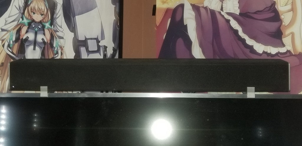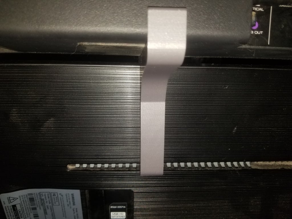 Simpelt vægbeslag til en Vizio SB2920-C6 soundbar, der passer til ovenpå et 40" Samsung KU7000 serie TV. Dette beslag glider over toppen af TV'et og fastgøres derefter nemt på bagsiden af TV'et i en slids til ventilation, hvilket skaber en pæn og ryddelig installation.