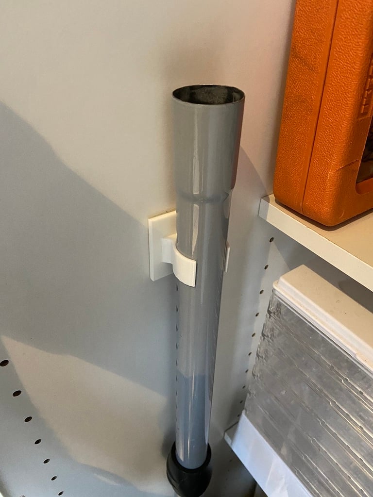 Holder til 32 mm rør, koste osv. Lavet til støvsuger tilbehør for at organisere rengøringskabet. Designet med et 50x50 mm fodaftryk til dobbeltklæbende tape (medfølger ikke) vedhæftning.