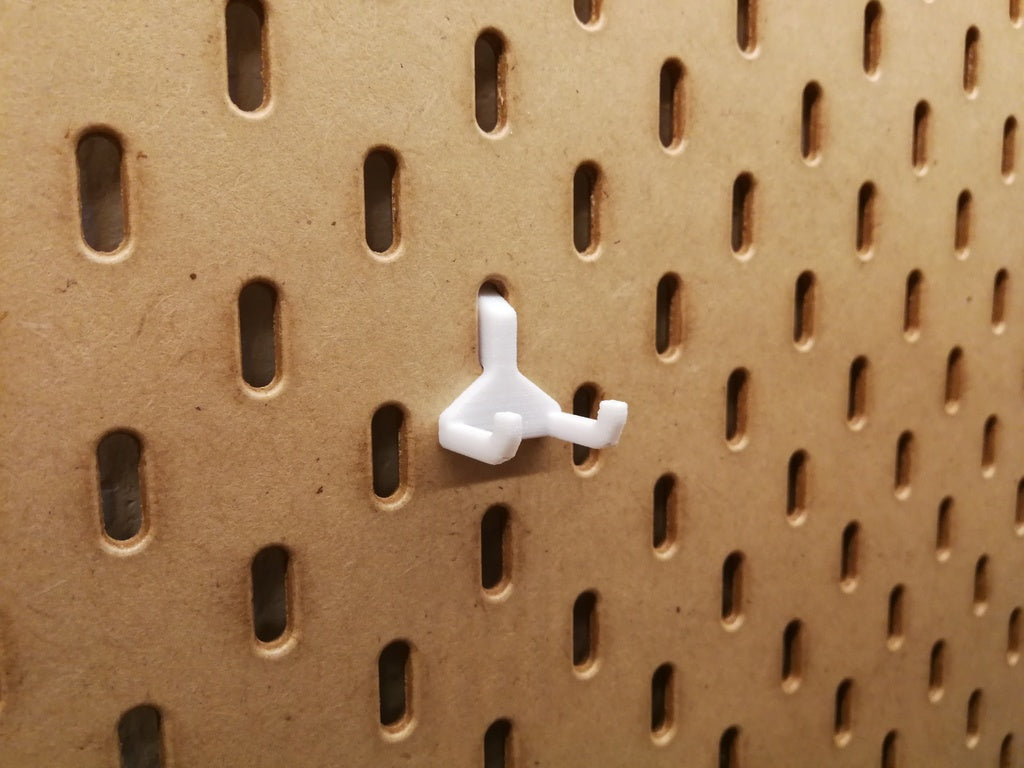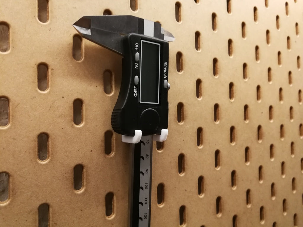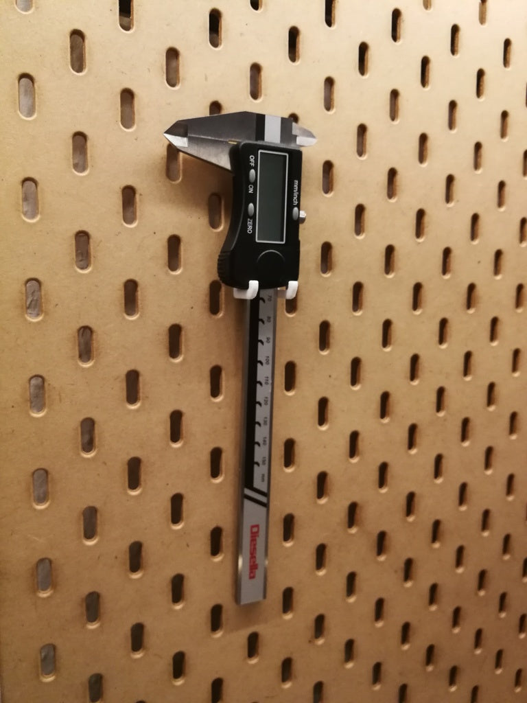 Caliper holder til IKEA Skådis. Dette holder er designet til at opbevare en kaliber på en IKEA Skådis Pegboard. Holderen måler 17 mm mellem de to kroge og er 14 mm dyb, som angivet på et af billederne.
