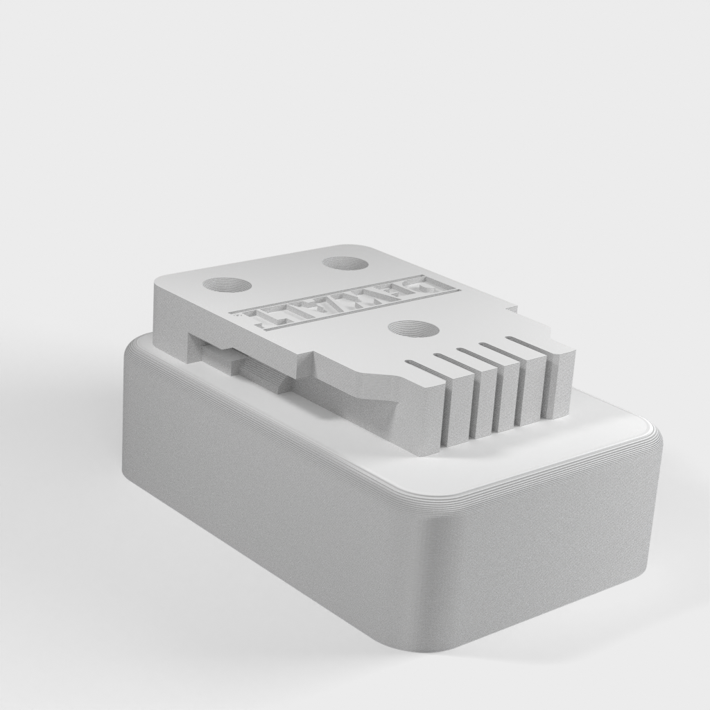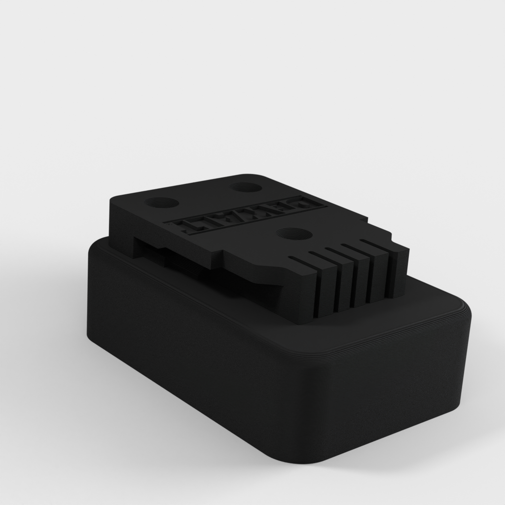 Dette er en simpel DeWalt værktøjsholder for bormaskiner/påvirkninger at hænge fra under en hylde eller bordplade, med tilstrækkelig plads til at rumme den krog, der normalt er monteret på bormaskiner/ påvirkninger osv.