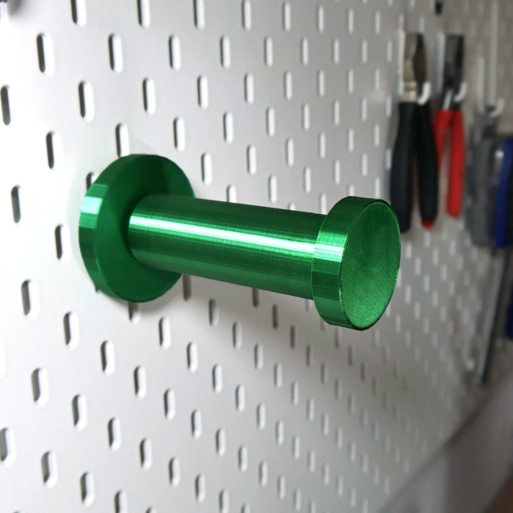 Skadis Spool Holder er et nemt at samle og adskille redskab, der passer perfekt til din IKEA Skadis opslagstavle. Den består af tre dele, der hver især skrues sammen for nem justering eller udskiftning. Den specielle grønne farve fremstilles ved hjælp af 3DJake Ultra Satin. Det er det oplagte valg til at holde dine spole på plads haengende fra din opslagstavle.