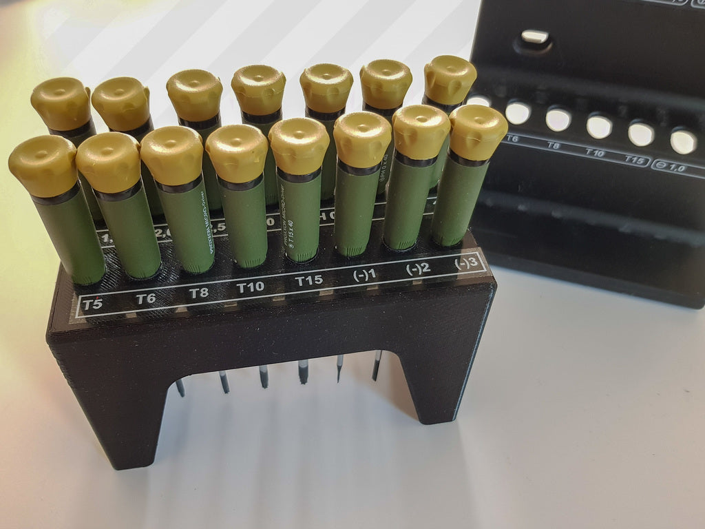 Dette er en skruetrækkerholder til Proxxon skruetrækkersæt. Den er designet til at stå fint på bordet, selvom sættet oprindeligt er beregnet til vægmontering. Holderen forhindrer skruetrækkere i at falde på gulvet og gør det nemmere at organisere dit værktøj.