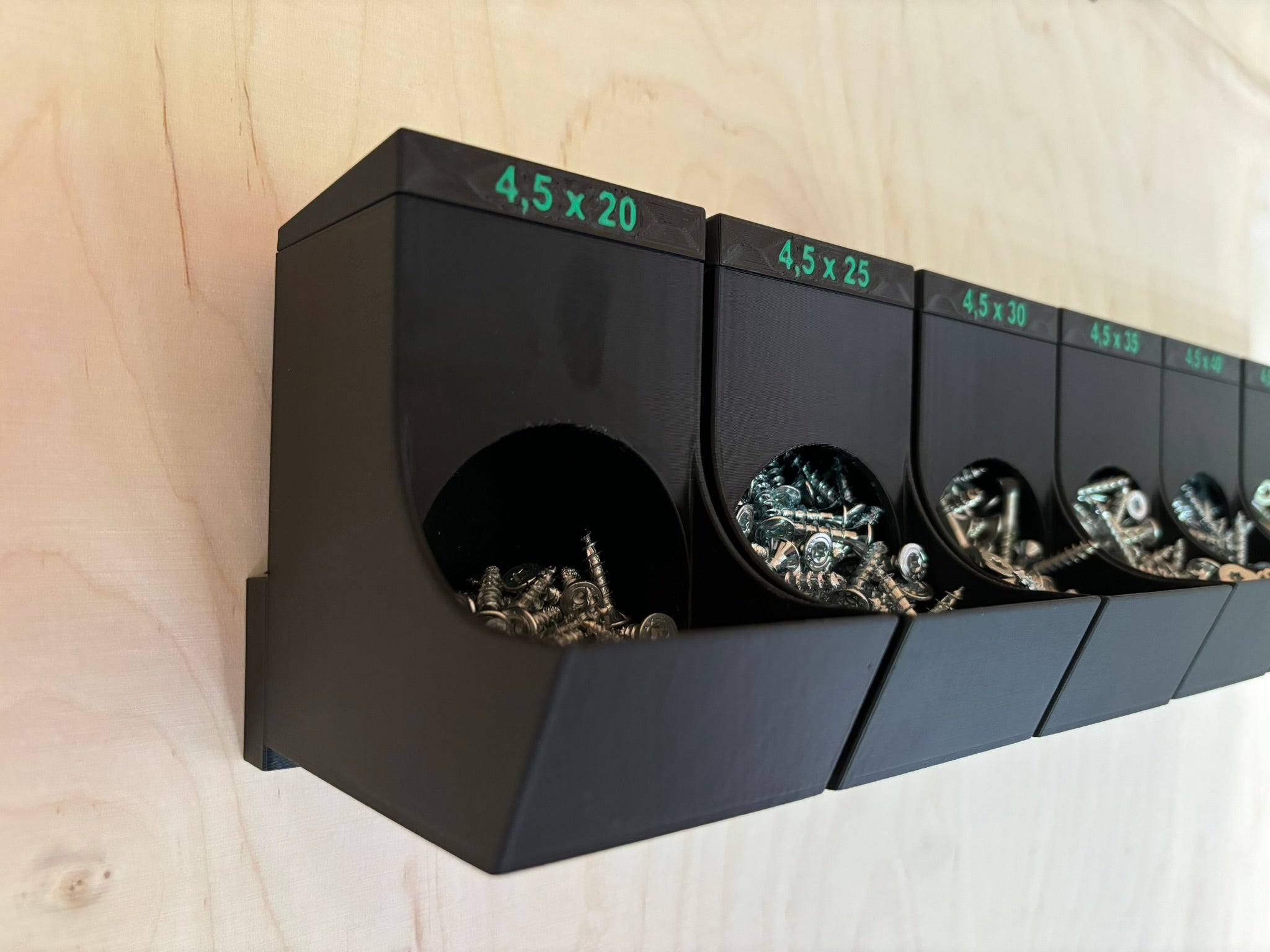 Screw Feeder er en praktisk opbevaringsløsning, der kan rumme op til fire containere, som kan tages ud hver for sig. Denne alsidige opbevaringsenhed er ideel til organisering af skruer, med mulighed for at opbevare skruer fra forskellige mærker og størrelser, hvilket gør den til et nyttigt værktøj i værkstedet. Udover skruer kan du også opbevare andet lille værktøj eller reservedele, hvilket gør den perfekt til alle, der ønsker at holde deres arbejdsområde ryddeligt.
