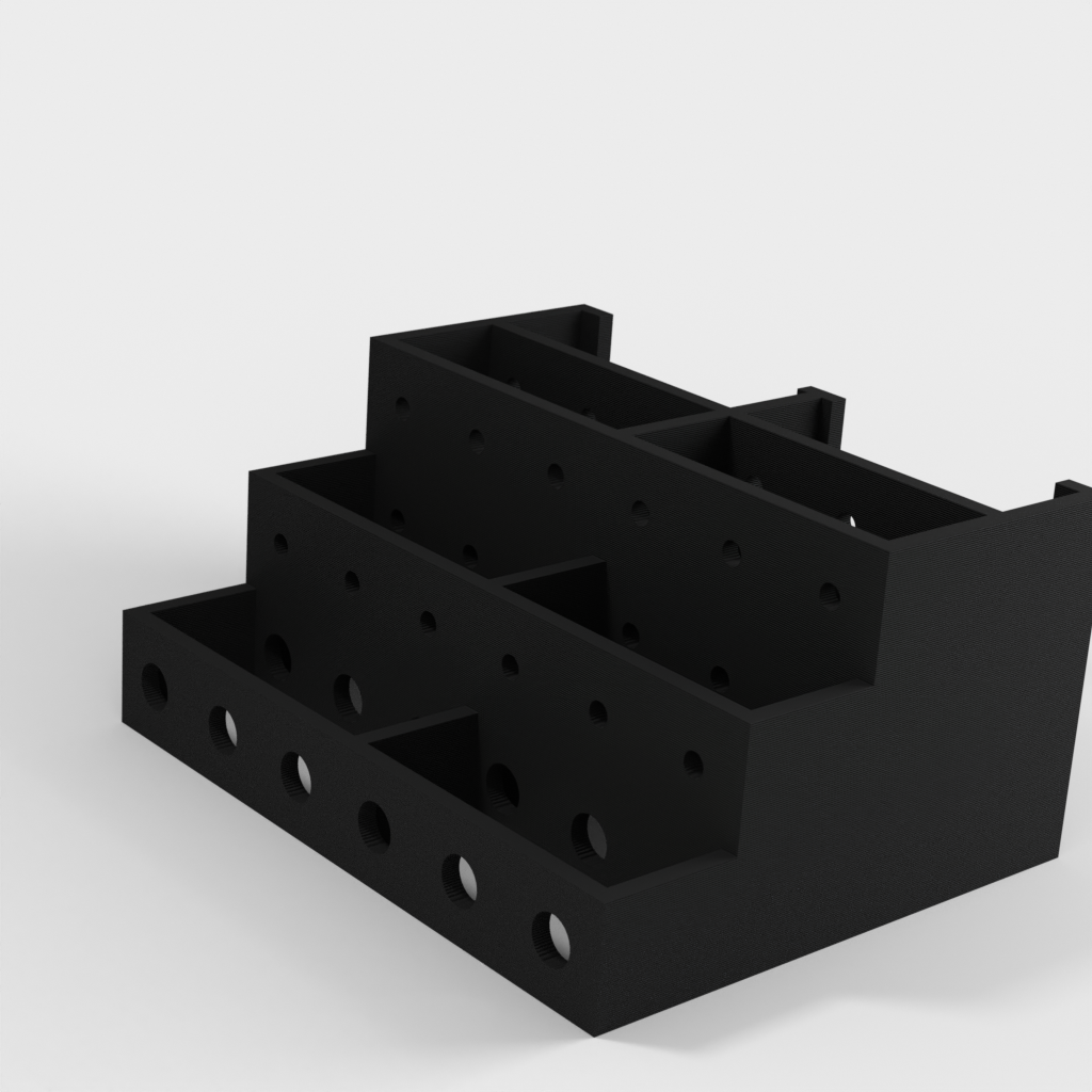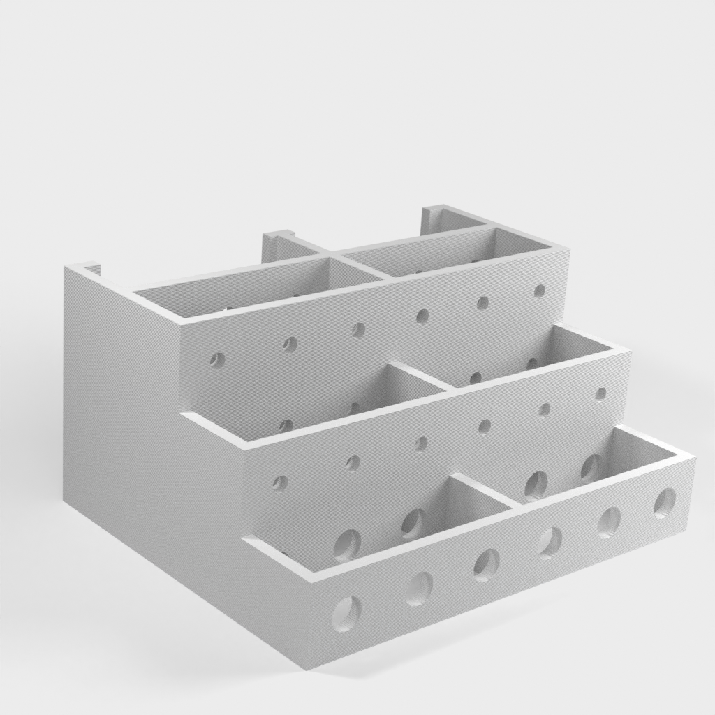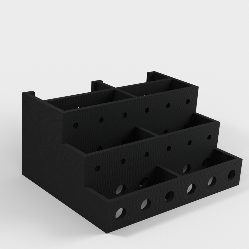 Med denne skruetrækkerholder får du nemt og praktisk styr på dine skruetrækkere. Holderen har plads til 3 sæt af 6 skruetrækkere, så du til enhver tid har et ordnet overblik over dit værktøj. Hver skruetrækker har sin egen plads, med tre niveauer til kort, mellem og lange skruetrækkere. For en version til vægophæng, se dette design: https://www.thingiverse.com/thing:1240992