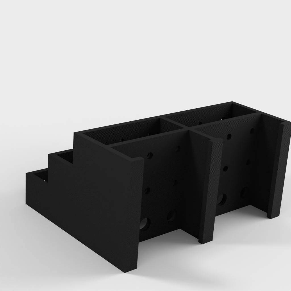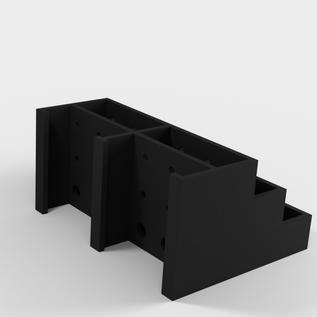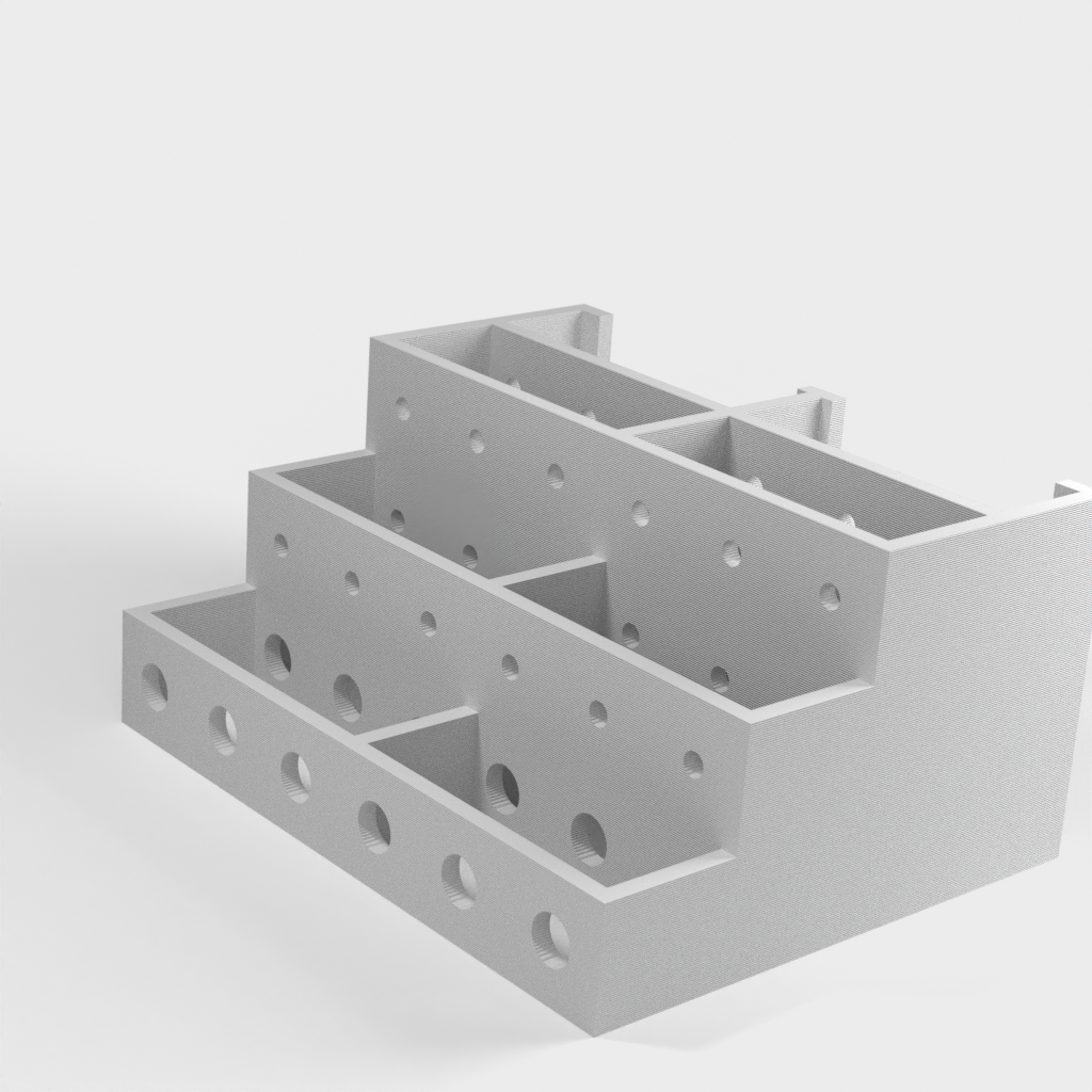 Med denne skruetrækkerholder får du nemt og praktisk styr på dine skruetrækkere. Holderen har plads til 3 sæt af 6 skruetrækkere, så du til enhver tid har et ordnet overblik over dit værktøj. Hver skruetrækker har sin egen plads, med tre niveauer til kort, mellem og lange skruetrækkere. For en version til vægophæng, se dette design: https://www.thingiverse.com/thing:1240992