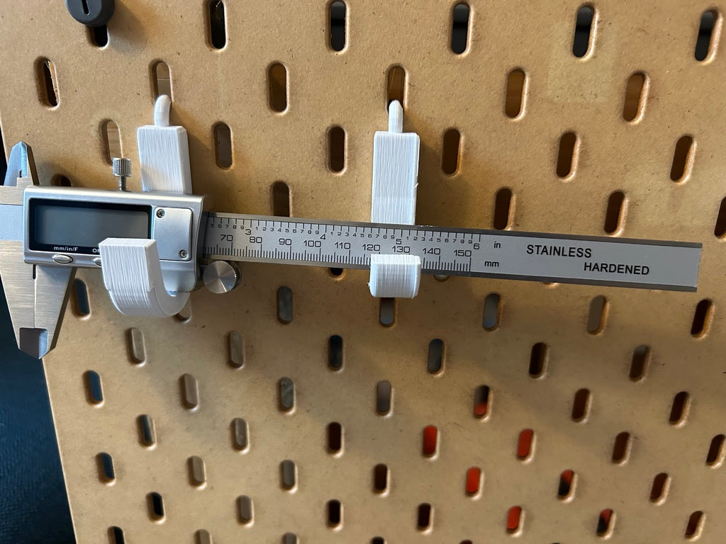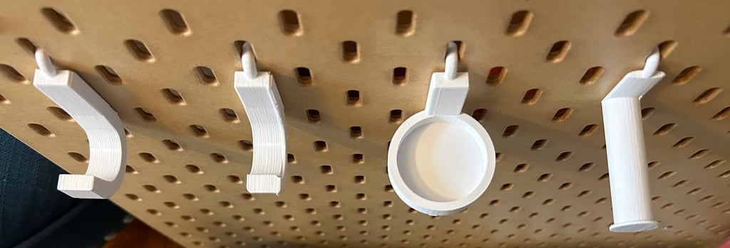 Dette er en samling af specielt designet pegs til IKEA SKÅDIS pegboard. Hver peg er designet til at passe forskellige værktøjer og genstande med forskellige dimensioner. Pegene inkluderer en længere krog til bredere genstande, en spole- eller bånderulleholder og en speciel rund en, der kan bruges til at hænge en varmepistolen. Derudover er basen af krogen også tilgængelig hver for sig, hvilket kan tilpasses efter dine specifikke behov. Hver krog og holder er designet til at passe perfekt med IKEA SKÅDIS pegboard huller, der måler ca. 6 mm og er placeret 34 mm fra hinanden.