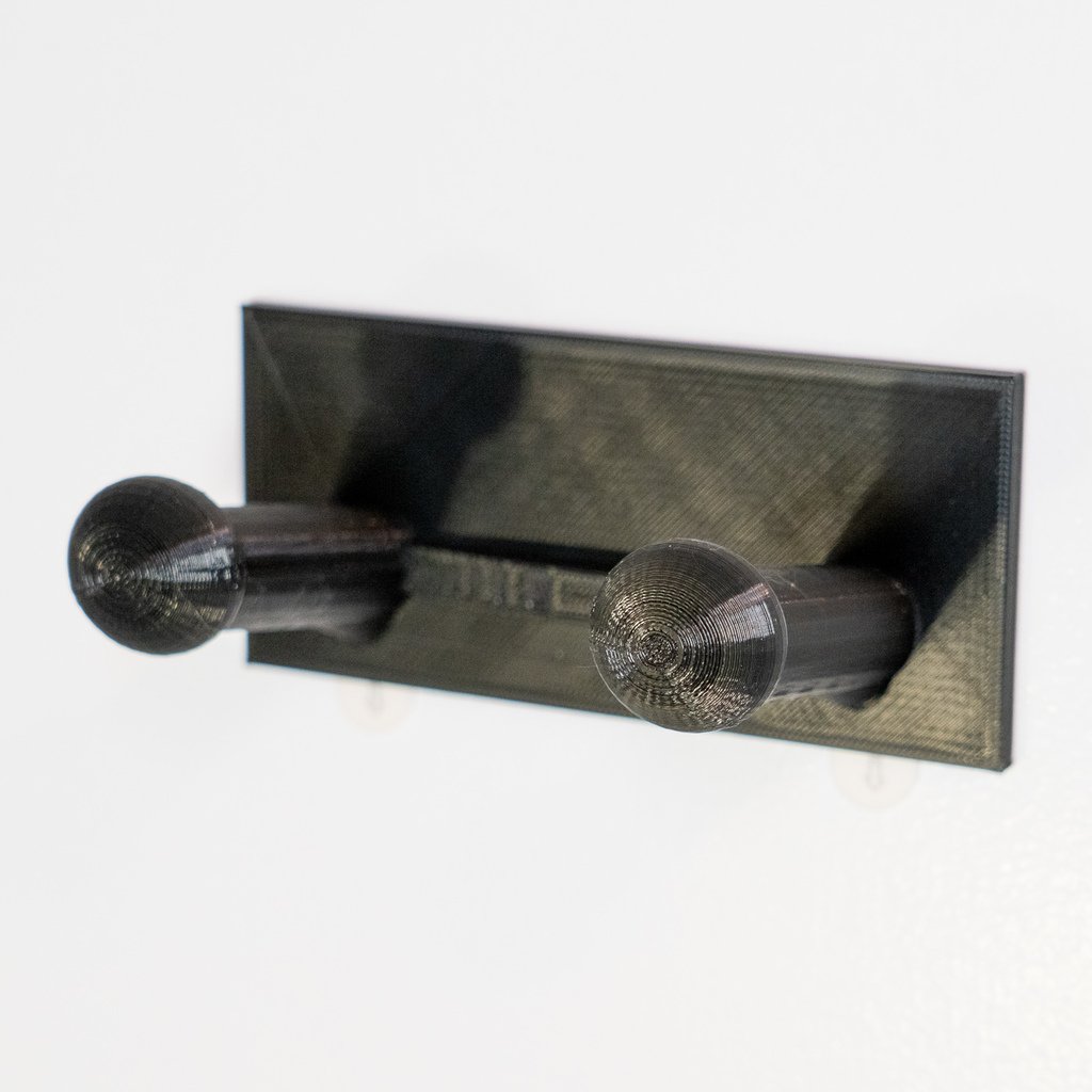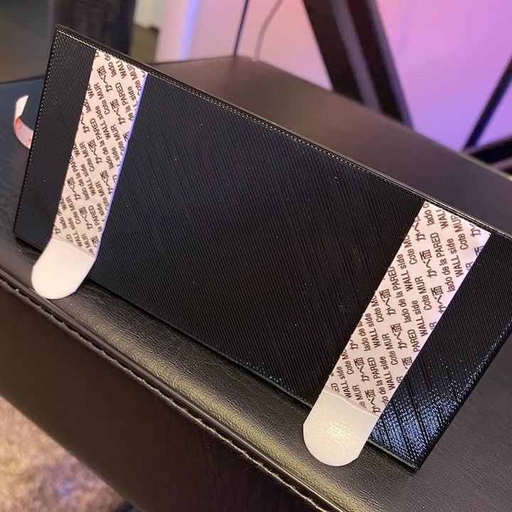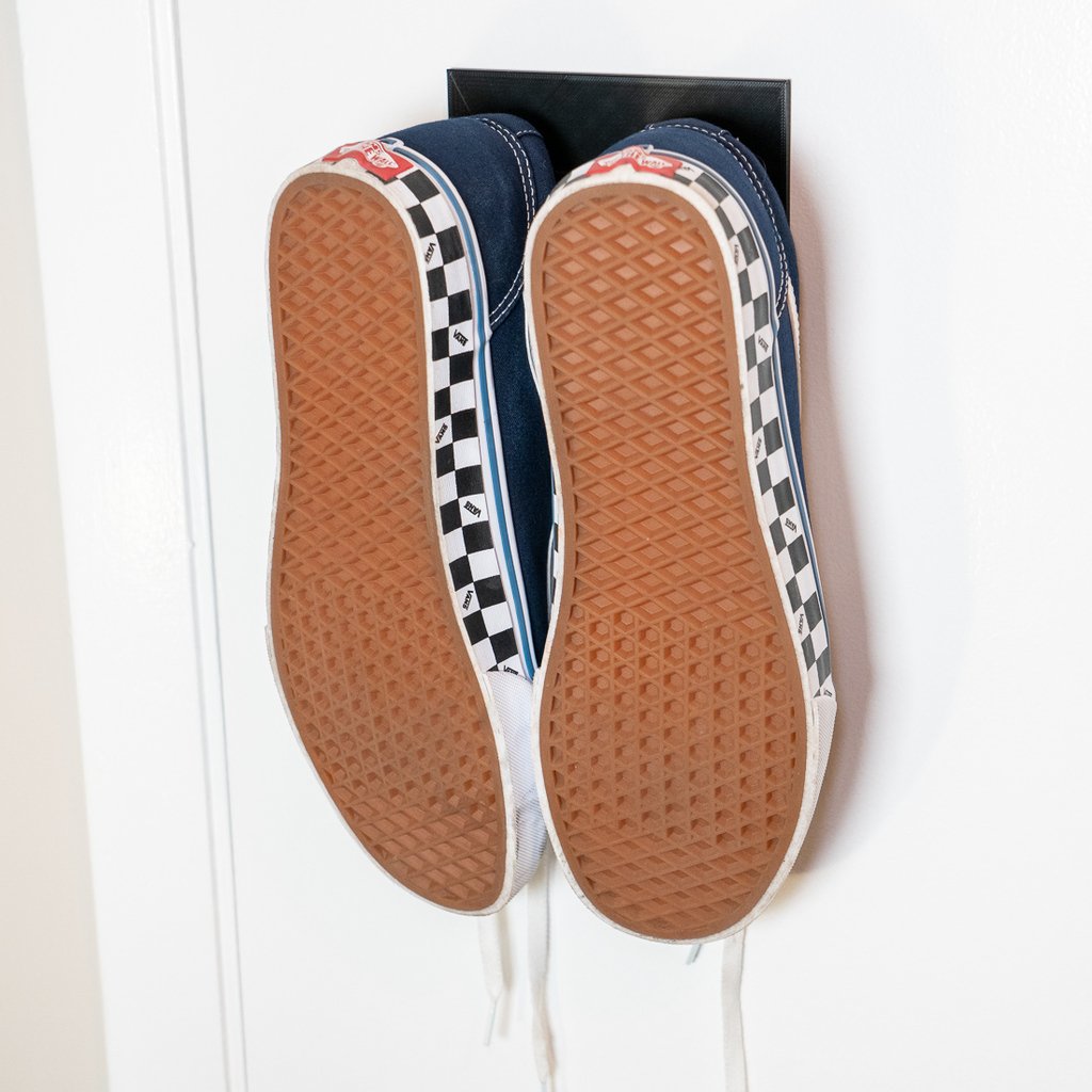 Et skohylde til væggen. Skohylden kan monteres direkte på en væg eller dør ved hjælp af dobbeltsidet klæbebånd, hvilket gør den aftagelig. Den er lavet, så hængeren på klæbebåndene hænger lidt under skohylden, så de kan fjernes, hvis det er nødvendigt.