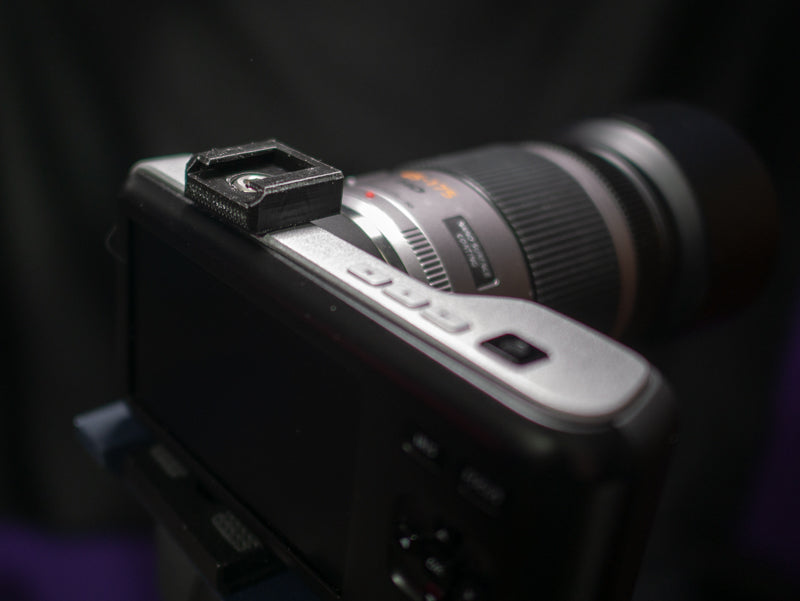 Denne specifik del er designet, fordi mit Blackmagic Design Pocket Cinema Camera ikke har en hotshoe/coldshoe. Den har dog et top 1/4-20 monteringspunkt. Så i stedet for at købe en af disse fra Amazon og vente på levering, designede jeg en hurtigt i Fusion 360.