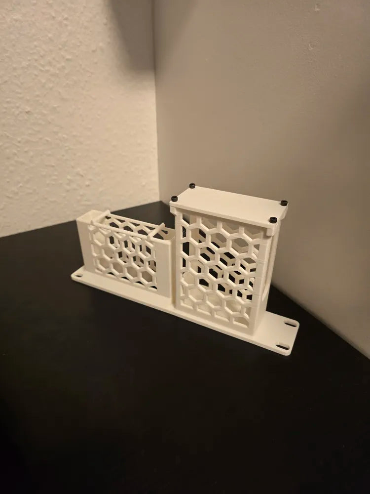 - Designet til at montere en Unifi UCG Fiber PSU og en Unifi Flex Mini switch i et 10-tommer rack.