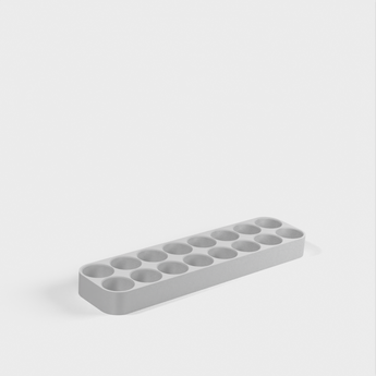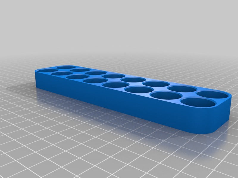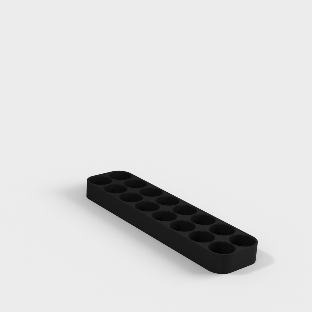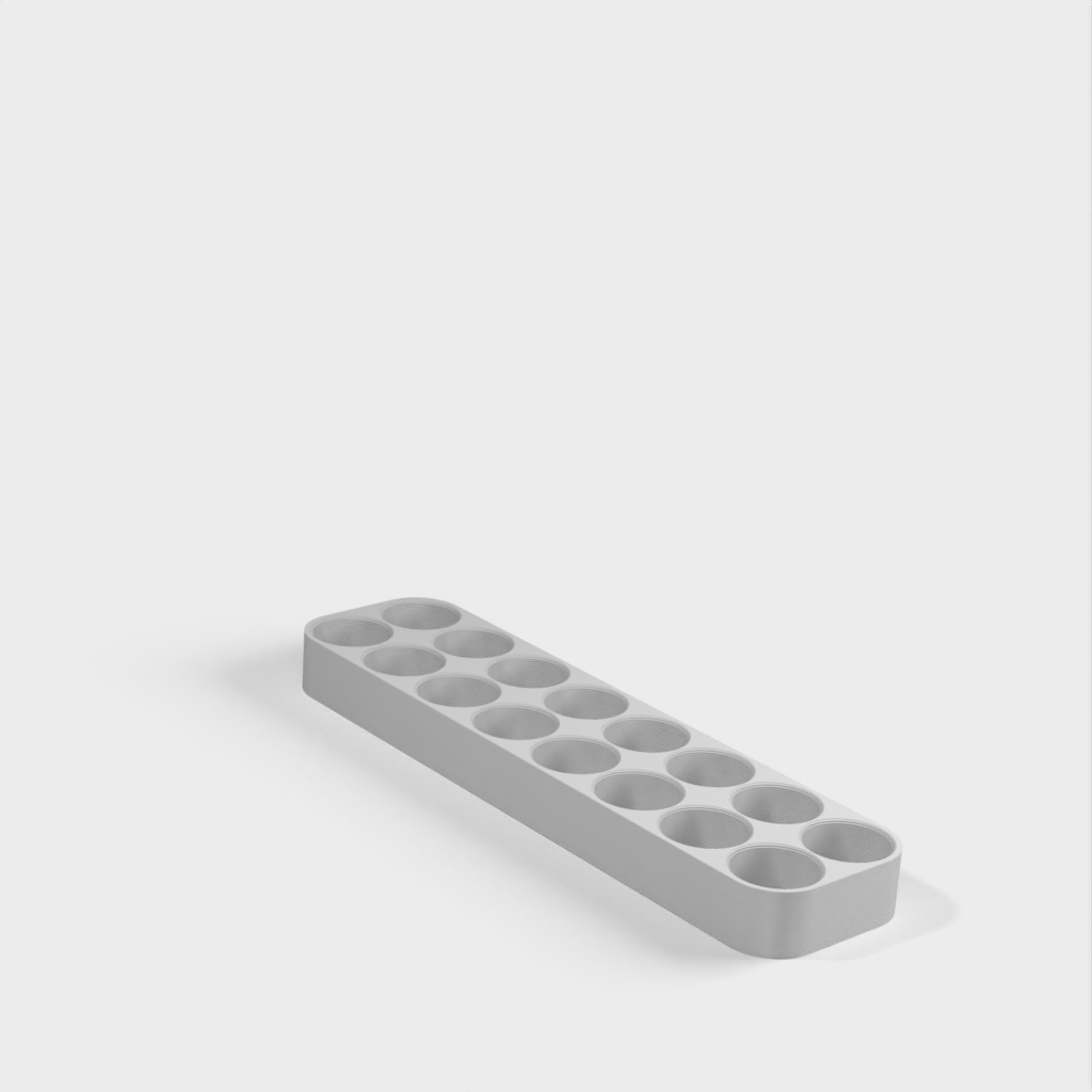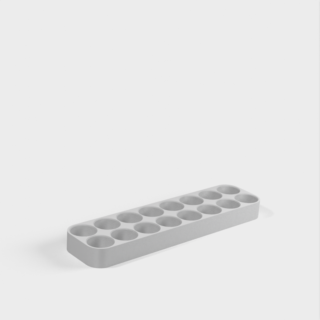 Dette er en simpel 18650 batteriholder til opbevaring på hylde eller bord. Designet er justerbart ved hjælp af OpenSCAD, så dimensioner, sikkerhedsmargen og antal batterier kan tilpasses efter behov. Den vedhæftede stl-fil er beregnet til 16 batterier.