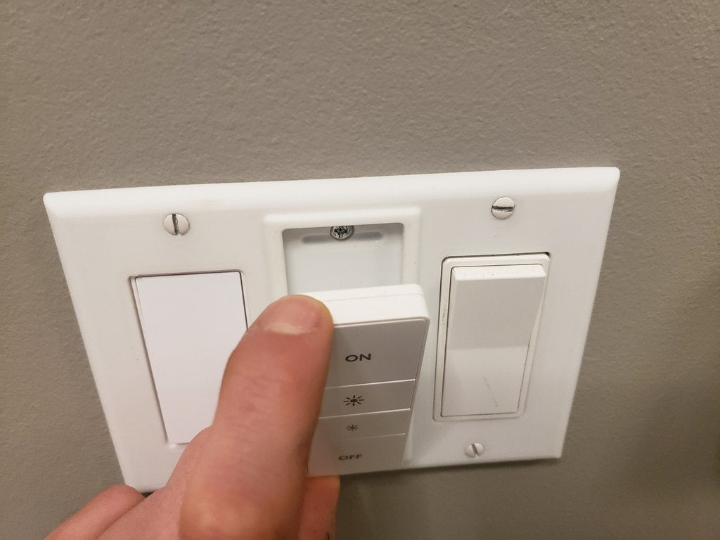 Fjernbetjeningen holdes sikkert på plads ved hjælp af standard Hue-magneter, som kan fastgøres med en dråbe lim for optimal stabilitet. Dette design sikrer en ren æstetik og praktisk adgang til dine smarte belysningsfunktioner, mens du bevarer muligheden for at betjene traditionelle lyskontakter ved siden af. Det er et praktisk stykke Philips Hue tilbehør, der hjælper med at strømline din smart home-opsætning og gør styring af f.eks. Philips Hue lysbånd mere intuitivt.