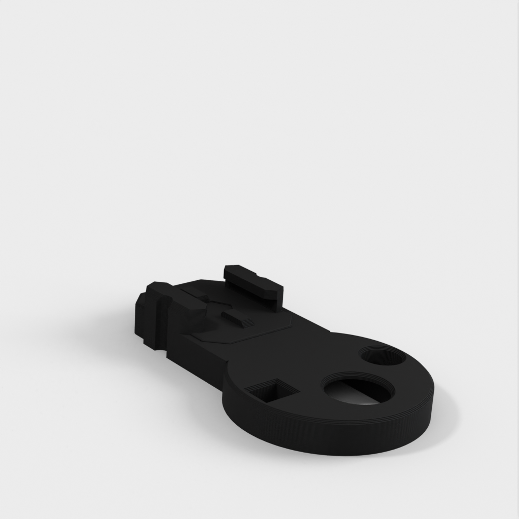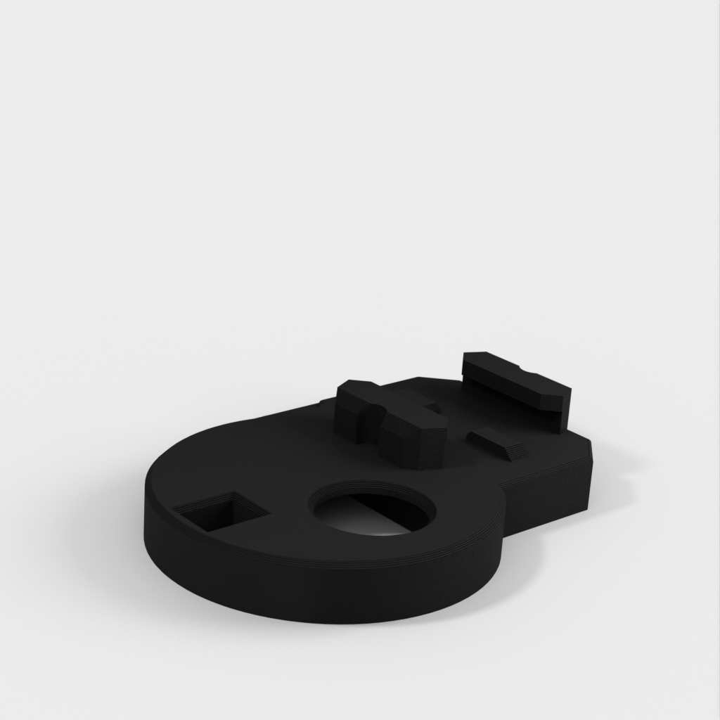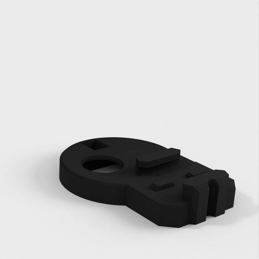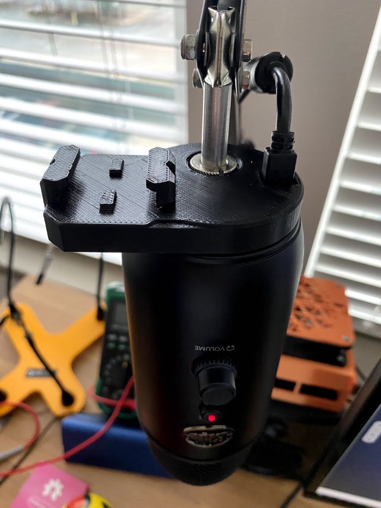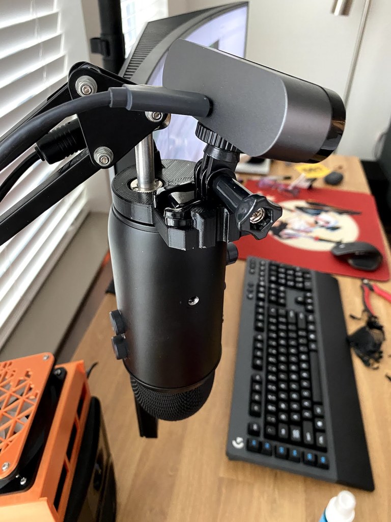 Dette er et beslag til et Blue Yeti-mikrofon, der giver mulighed for at montere et GoPro eller webcam ovenpå (eller faktisk nedenfor) mikrofonen. En ideel løsning for dem med en vertikal, stakket skærmopsætning, da det holder webcamet forhøjet og vender mod brugeren fra siden.