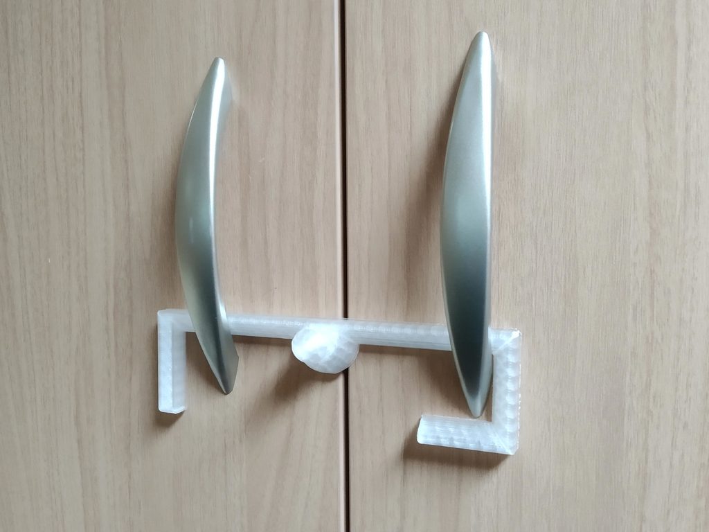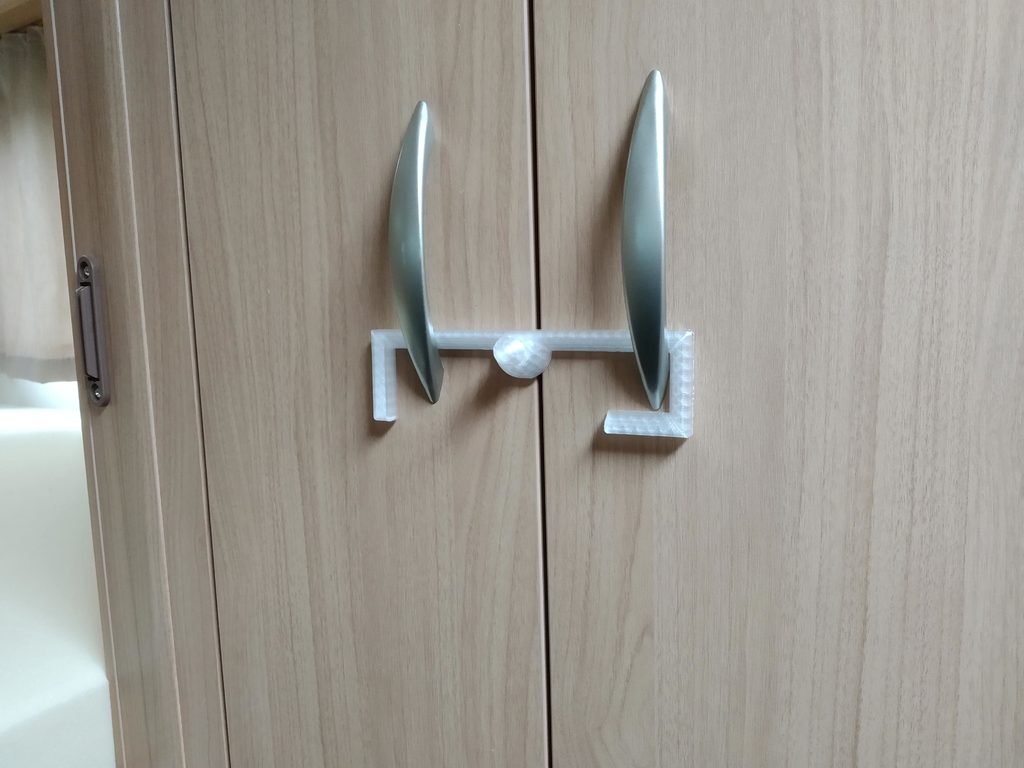 En lille lås designet til at holde skabsdøre lukkede under transport i din campingvogn. Hvis dine skabsdøre i campingvognen har en vane med at åbne under rejser, kunne dette være en praktisk løsning. Det er en simpel krog, der latches over begge dørhåndtag og forhindrer dem i at åbne.