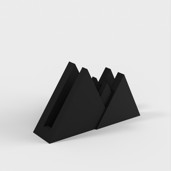 En simpelt men robust lodret stativ til en Macbook Pro med et integreret bjerglandskab. Selve hullet Macbook'en sidder i er 1,62 cm bred og passer derfor til de fleste modeller.